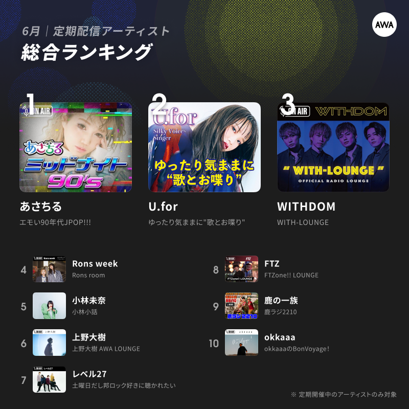 4位に輝いたのは、6月から新規配信を行った2人組シンガーソングライターユニットのRons week。前月に引き続き、シンガーソングライターの上野大樹、小林未奈もTOP10に名を連ねています。その他、文藝天国、多部大をゲストアーティストに迎えたコラボ配信が好評だったFTZなど、注目のアーティストがTOP10に名を連ねています。7月も新規配信アーティストが多数予定しておりますので、引き続きAWAのラジオ配信ラウンジをお楽しみください。