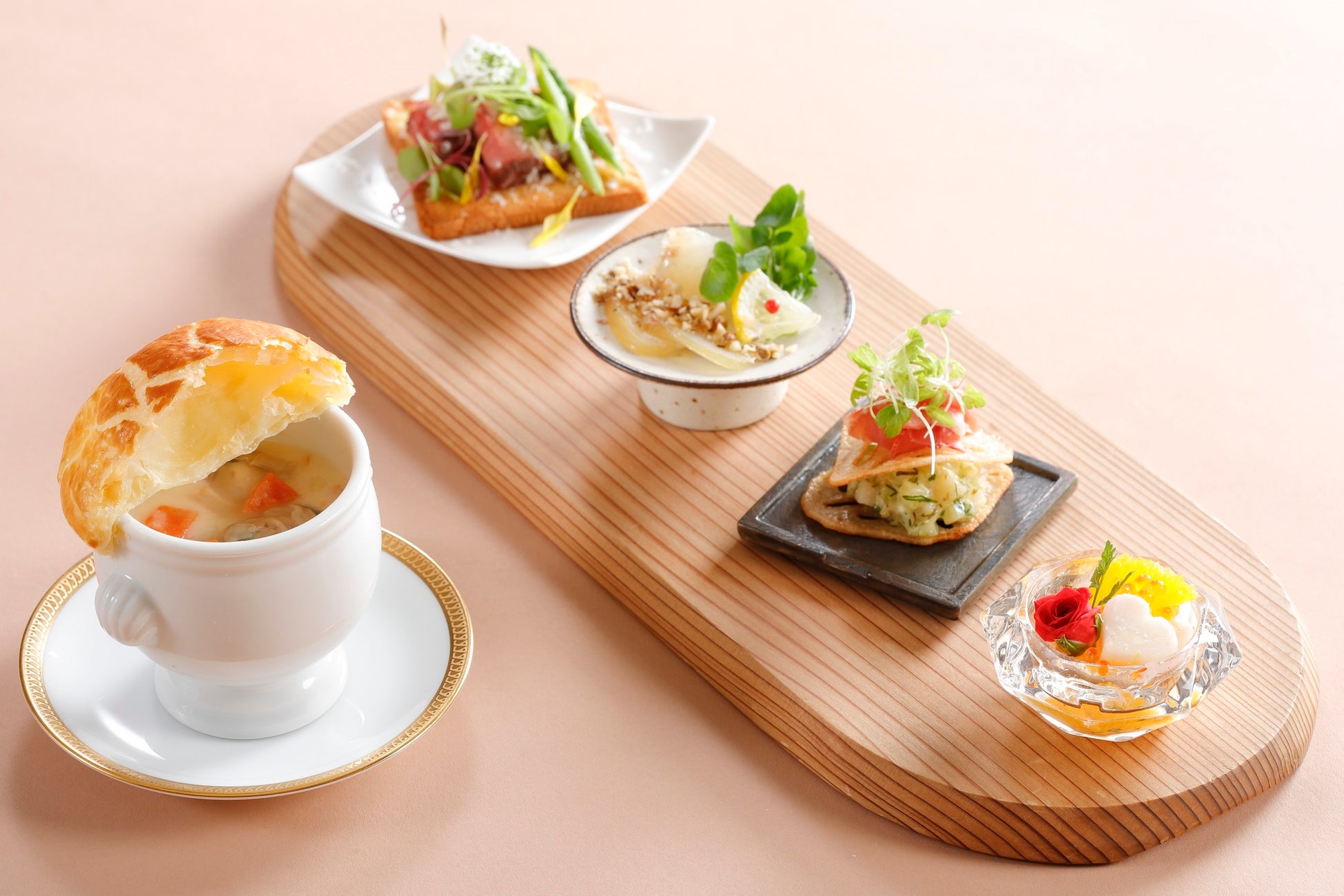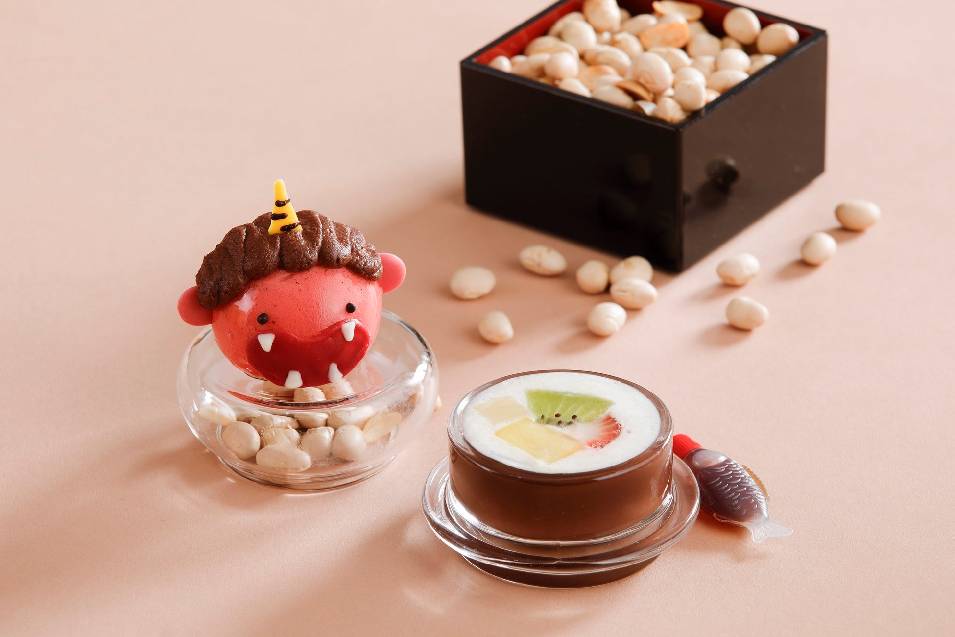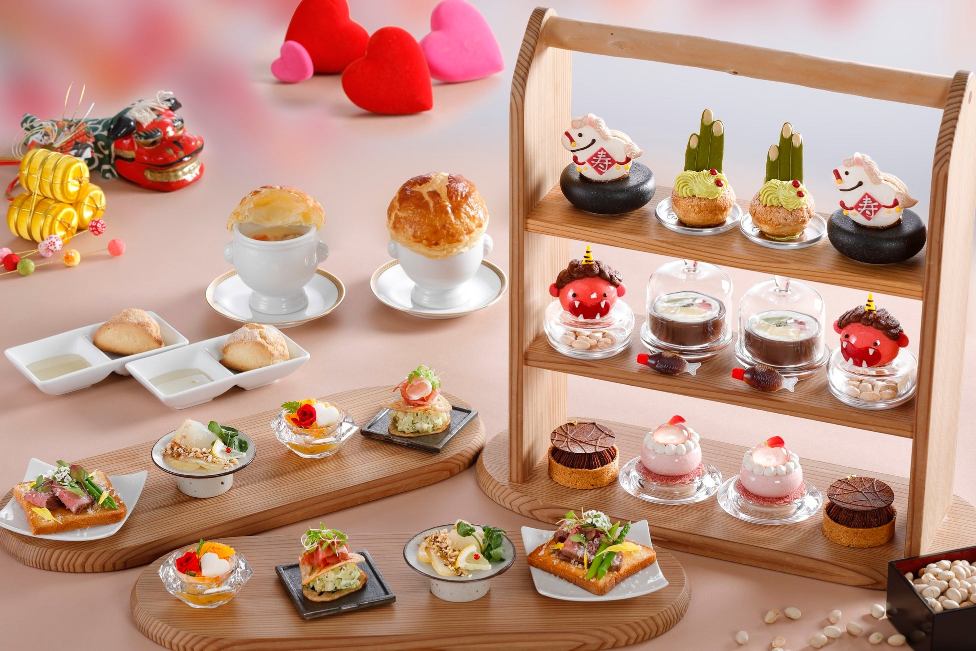 正月からバレンタインデーにかけて、冬のイベントを一度に楽しめるアフタヌーンティーをご用意しました。スタンド上段は「新春」をテーマに2026年の干支「丙午」と門松をモチーフにしたスイーツを、中段は「節分」をテーマに赤鬼と恵方巻に見立てたスイーツを、下段は「バレンタイン」をテーマに、ショコラタルトと淡いピンク色のスイーツを盛り付けました。また、クラムチャウダーのパイ包み焼きなど、冬にぴったりなセイボリーもご用意していますので、スイーツとともにお楽しみいただけます。
