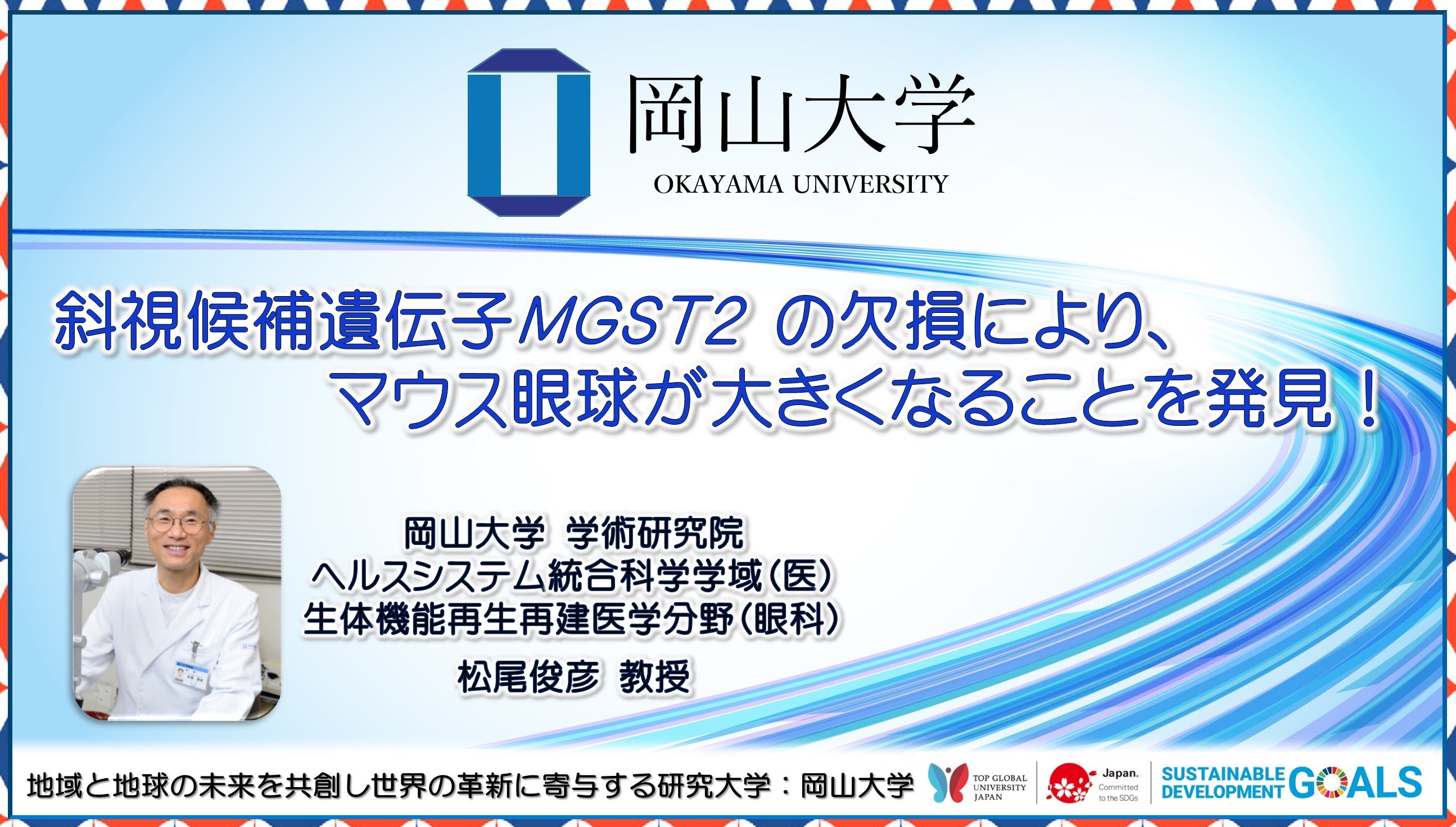 国立大学法人岡山大学(本部:岡山市北区、学長:那須保友)の学術研究院ヘルスシステム統合科学学域(医)生体機能再生再建医学分野(眼科)の松尾俊彦教授、岡山大学大学院ヘルスシステム統合科学研究科博士後期課程の朝木力格大学院生、杉本昂平大学院生(研究当時、現・岡山画像診断センター診療放射線技師)、岡山大学学術研究院医歯薬学域(医)脳神経機構学分野の宮地まり助教、細谷修助教、岡山大学学術研究院医歯薬学域(薬)生体機能分析学分野の上田真史教授、群馬大学生体調節研究所の畑田出穂教授、堀居拓郎准教授、小林良祐研究員は、斜視候補遺伝子MGST2の機能をなくしたマウス系統を樹立し、そのマウスでは眼球が上下左右に有意差をもってわずかながら大きくなっていることを小動物用のMRI検査機器で撮影した画像解析で明らかにしました。