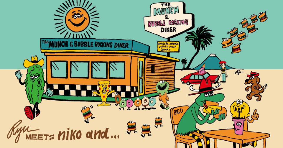今回のコラボレーションは、「MUNCH and BUBBLE ROCKING DINER」という架空のバーガーショップをテーマにして、Ryu Ambe氏がイラストを描き下ろしました。Ryu Ambe氏によって描かれるポップでキュートなキャラクターと、niko and ...コラボレーションならではのカラーリングは、レトロなアメリカンダイナーを彷彿させます。