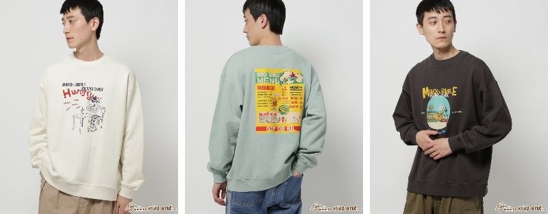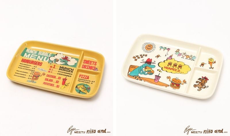 架空の「MUNCH and BUBBLE ROCKING DINER」で使用されていそうな、トレーやプレート、コースターなどのテーブルウェアアイテムに加え、レジ横に展開されている雑貨をイメージした、コインケース、ポーチ、キーホルダーなどのアイテムを展開します。またniko and ...のコラボ企画としては初となる、繊細なディテールでリアリティに表現したオブジェは、ちょこんと座らせるユニークな仕様になっており、インテリアのアクセントになります。シャツやスウェット、キャップやショルダーバッグなどメンズアパレルと服飾雑貨の展開もお楽しみいただけます。