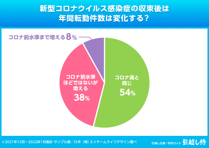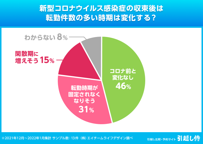 現在はオミクロン株が猛威をふるい感染拡大が続いておりますが、コロナの収束後も以前の状態に戻るというわけではなく、コロナ禍が転勤を見直すきっかけになり、件数が減少する、時期が変化する等が発生する可能性がありそうです。