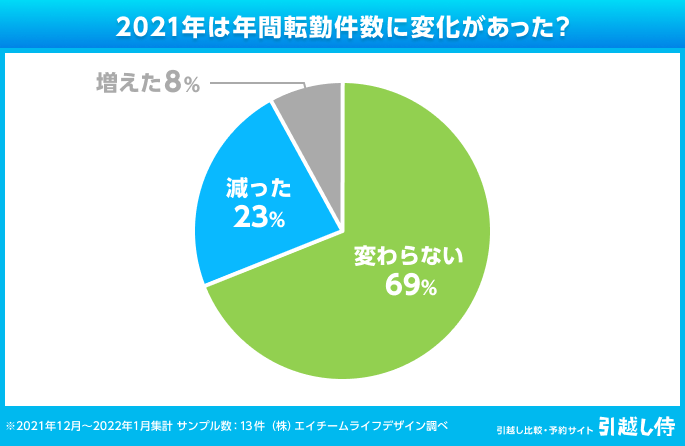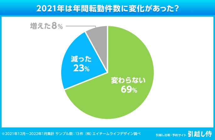 2021年の転勤件数は69%が「変わらない」、23%が「減った」と回答。2020年と同様に、転勤件数はコロナ前の水準に戻っていない様子が見られた。