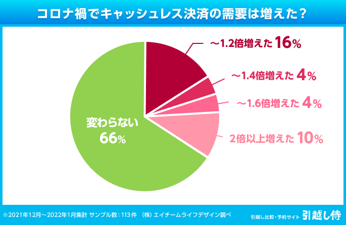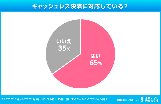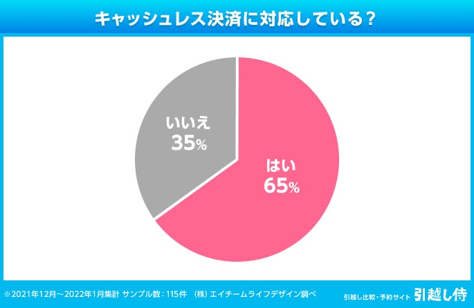 キャッシュレス決済を導入している引越し会社は65%。しかし、コロナ以前と比較して需要の増加はあまり見られず、66%の引越し会社がコロナ以前と変わらないと回答した。