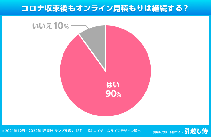 コロナをきっかけに本格的に始まった引越し見積もりのオンライン化も、実施している引越し会社は35%に留まっており、広く浸透している状況ではありません。しかし、実施している引越し会社の90%がコロナ収束後もオンラインでの見積もりを継続すると回答しており、新たな見積もりのスタンダードとなるかもしれません。