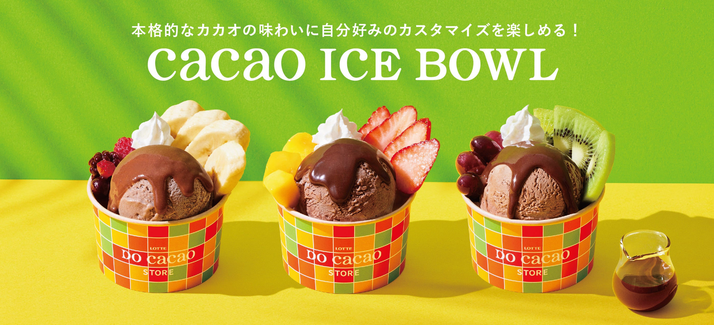 お店イチオシのメニューは「Cacao ICE BOWL」。「ガーナ」「パプアニューギニア」「インドネシア」の特長を生かした「Cacao ICE」に、自分好みのカスタマイズを楽しめるメニュー。ベースとなる「Cacao ICE」は、ナッツのようなコク深い「ガーナ」には甘酸っぱい苺、フルーティーな香りと酸味のある「パプアニューギニア」にはまろやかな甘味のバナナ、真っ赤なベリーや森林の香りを持つ「インドネシア」にはさっぱりとした酸味と甘味のキウイをそれぞれ組み合わせています。そこにお好みのフルーツと、ラムレーズン、オレンジピールなどのアクセントを組み合わせ、さらに3つの産地からカカオソースを選んでオリジナルの「Cacao ICE BOWL」をお楽しみいただけます。「LOTTE DO Cacao STORE」では今後もカカオの新しい可能性を発信するため様々なメニューを提供予定です。