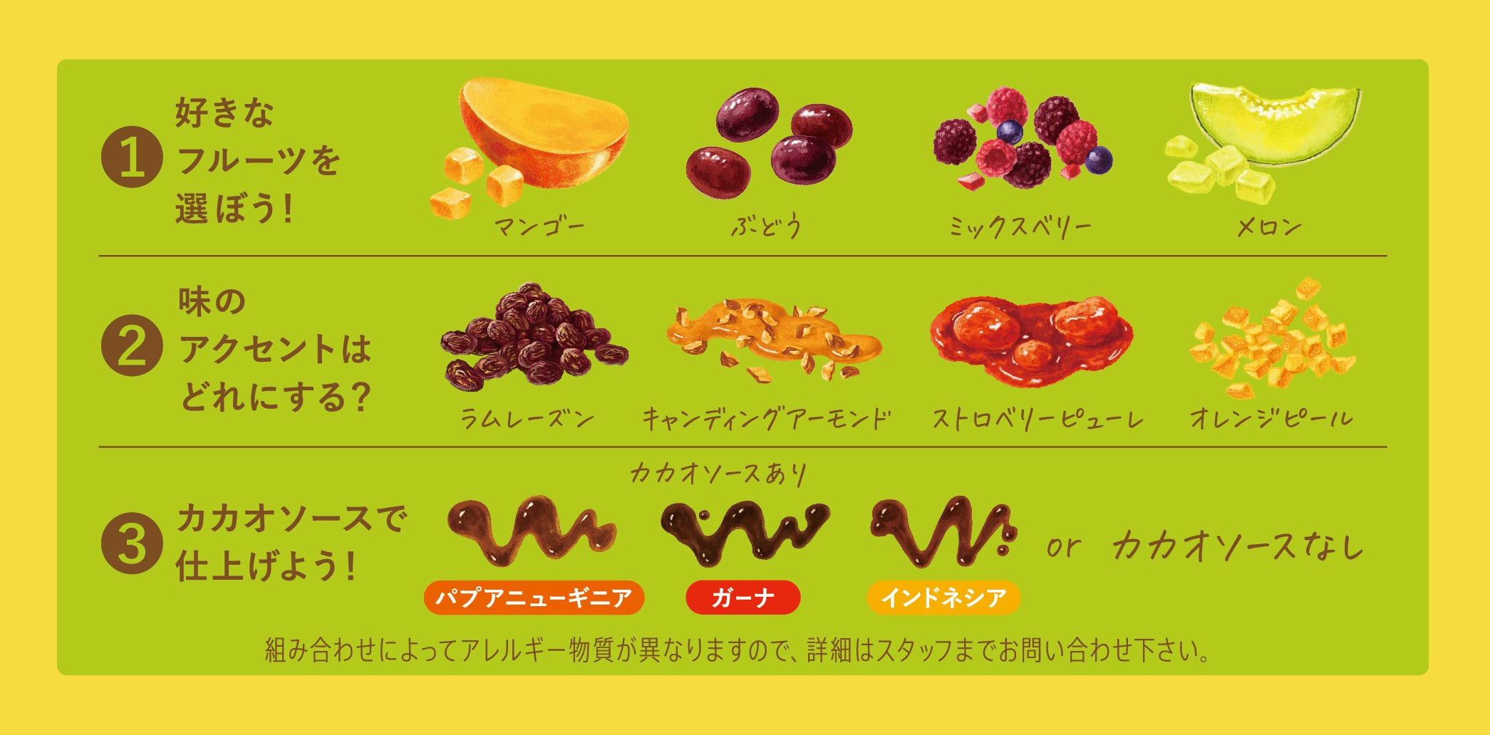 特長:3つの産地の「Cacao ICE」とフルーツの組み合わせを選び、お好みのフルーツと、ラムレーズン、オレンジピールなどのアクセントを組み合わせ、さらに3つの産地からカカオソースを選んで、自分好みにカスタマイズした「Cacao ICE BOWL」。自分ならではの食べ方を見つけて、「Cacao ICE」をもっと楽しんでみてはいかがですか?