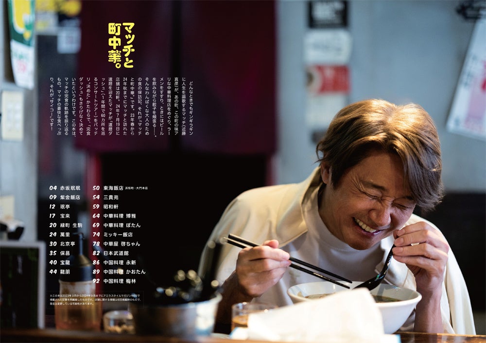 ムック本『AERA STYLE MAGAZINE PRESENTS 近藤真彦 マッチと町中華。』(2024年11月25日発売)は、そんな完食の軌跡を振り返りつつ、取材時のアザーカット他を盛り込んで一冊にまとめたもの。マッチの痛快な食べっぷり&飲みっぷりは、眺めているだけで「元気」がわいてきます。ワクワクが止まらないスペシャルな「読者プレゼント(抽選)」にもご期待ください!