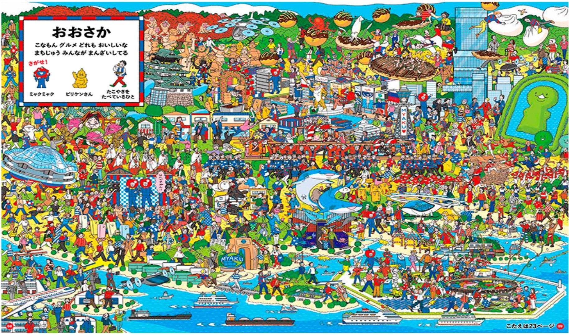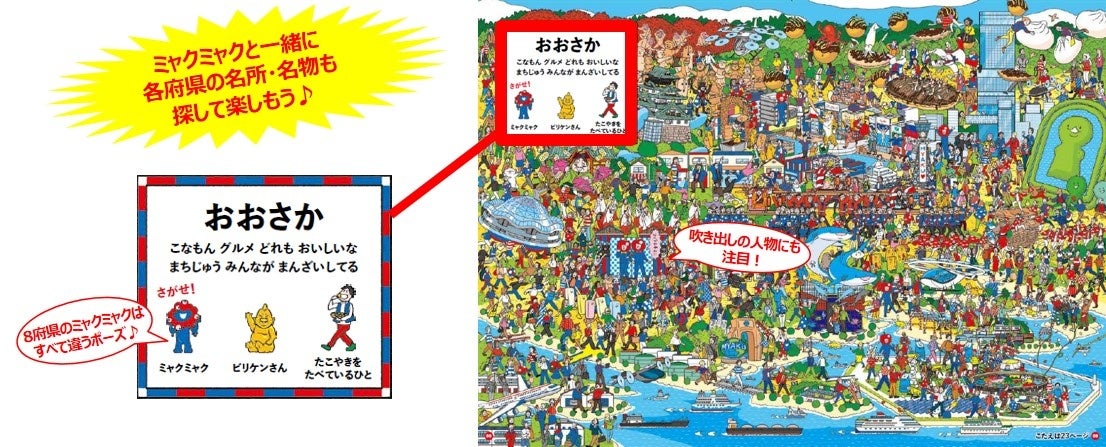 本書は、大阪・関西万博が行われる周辺地域の名所や名物があふれかえるイラストの中からミャクミャクを見つけ出す「さがし絵本」です。大阪はもちろん、京都、兵庫、奈良など関西広域連合である8府県の名所と、ミャクミャクの故郷「湧水地」にミャクミャクが隠れています。難易度高めで大人でも楽しむことができ、各地の名所・名物のイラストは子どもの地理の勉強にもなります。8府県それぞれのミャクミャクは違うポーズをしているので、ぜひ比べてみてください。