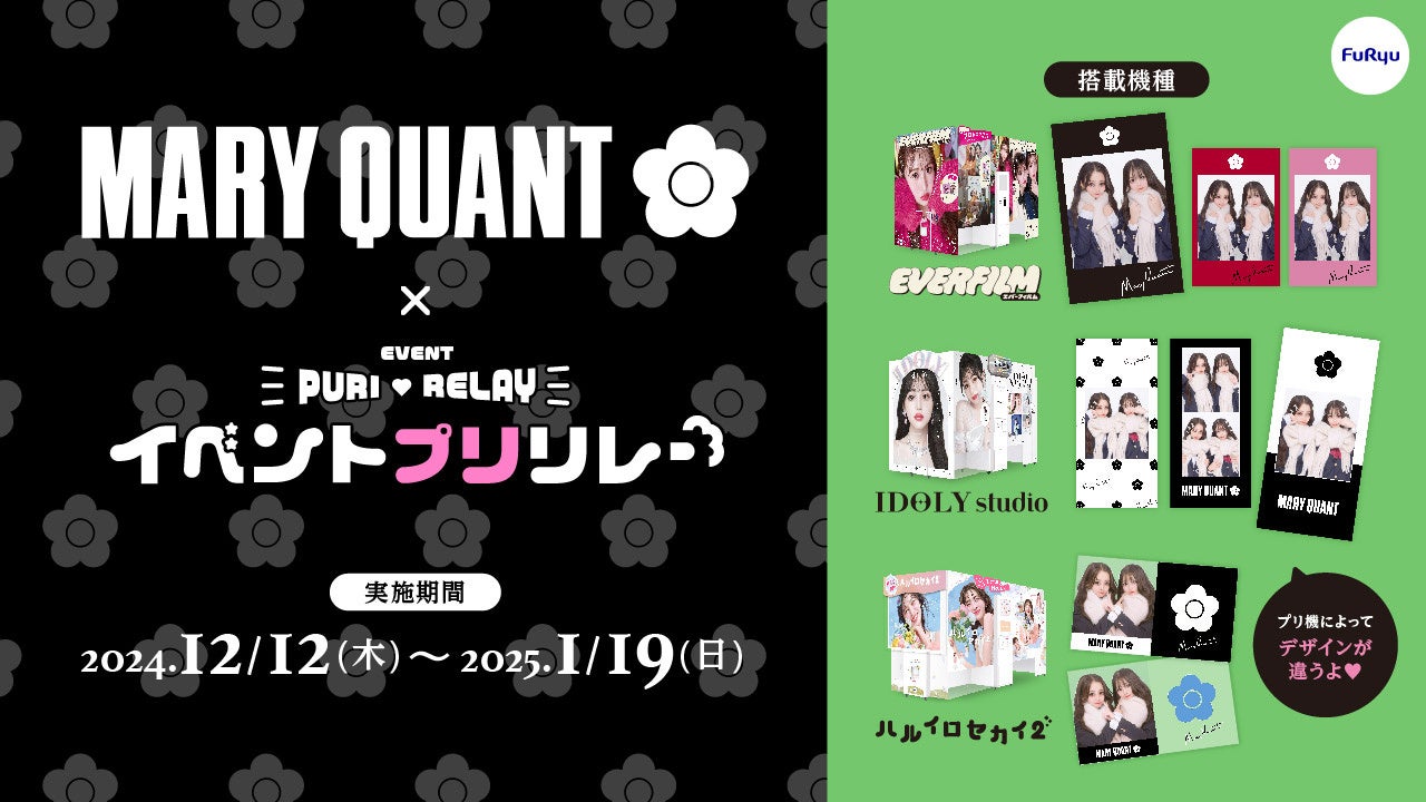 フリュー株式会社(本社:東京都渋谷区、代表取締役社長:三嶋隆、以下 フリュー)は、プリントシール(以下 プリ)機『EVERFILM』、『IDOLY studio』、『ハルイロセカイ2』にて、「マリークヮント(MARY QUANT)」とのコラボレーション(以下 コラボ)を12月12日(木)より期間限定で実施いたします。
