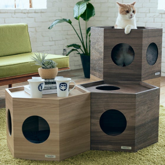 <フランスベッド>のペット用インテリアは、猫たちの好奇心をくすぐるアイデアと洗練されたデザインが魅力です。