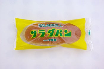 たくあんのマヨネーズ和えをふっくら焼き上げたコッペパンで挟んだサラダパン。誕生から60年以上経った現在も、地元のスーパーやコンビニなどで販売。たくあんのシャキシャキ食感とやわらかなコッペパンがクセになるロングセラー商品。
