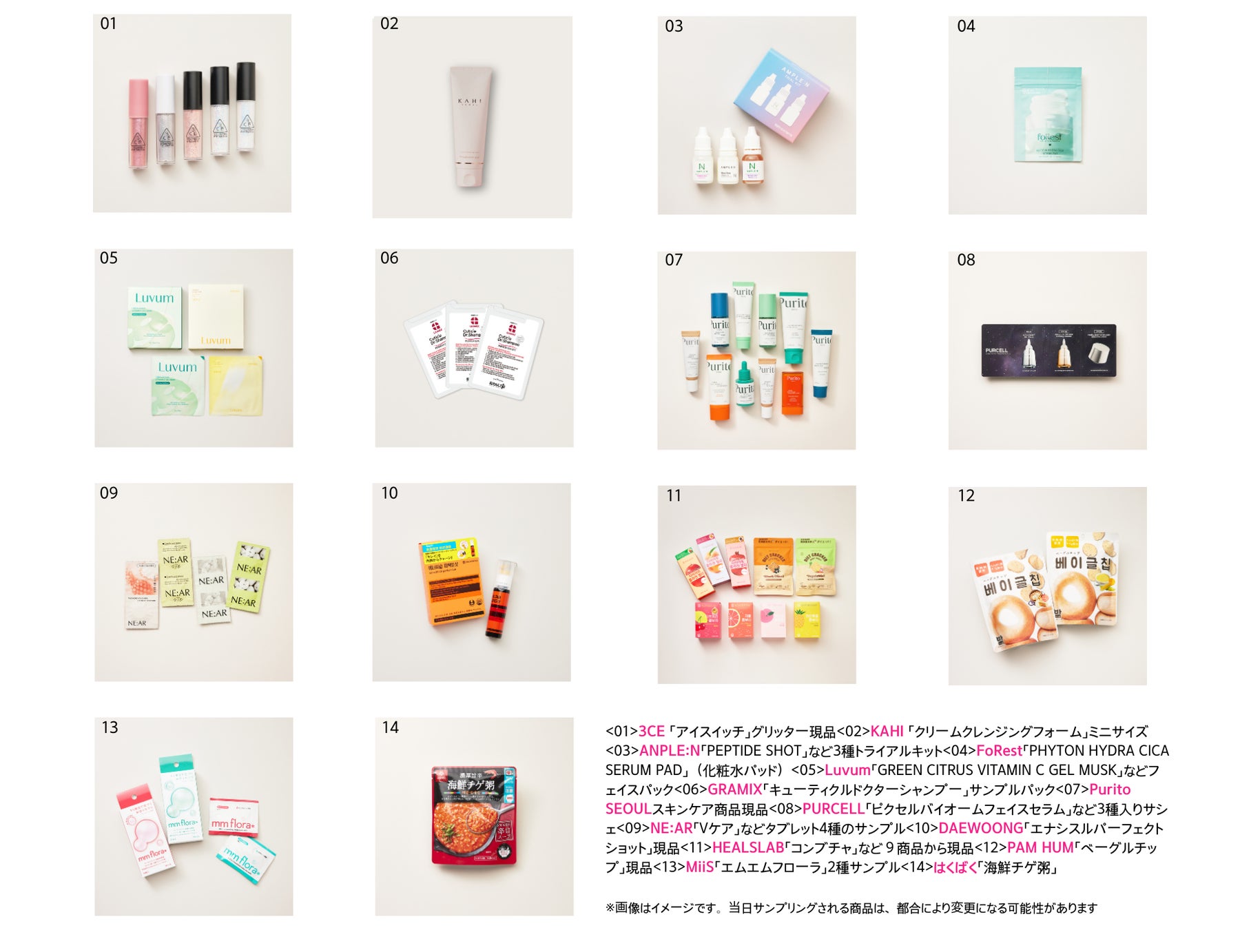 先着5,000名様に、種類豊富なお土産がランダムに入ったサンプリングバッグをプレゼント。コスメ・スキンケア商品から健康食品まで、さまざまな商品を封入予定です。