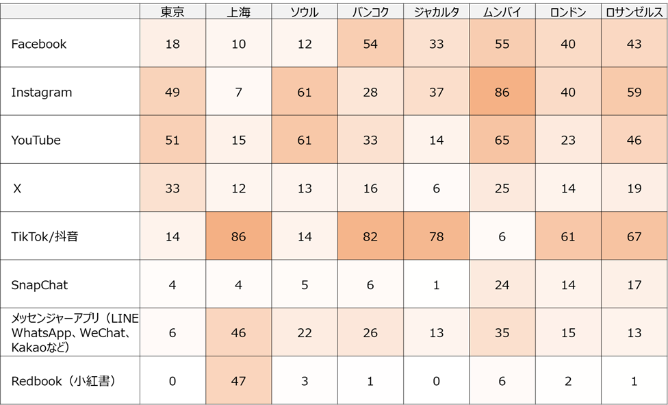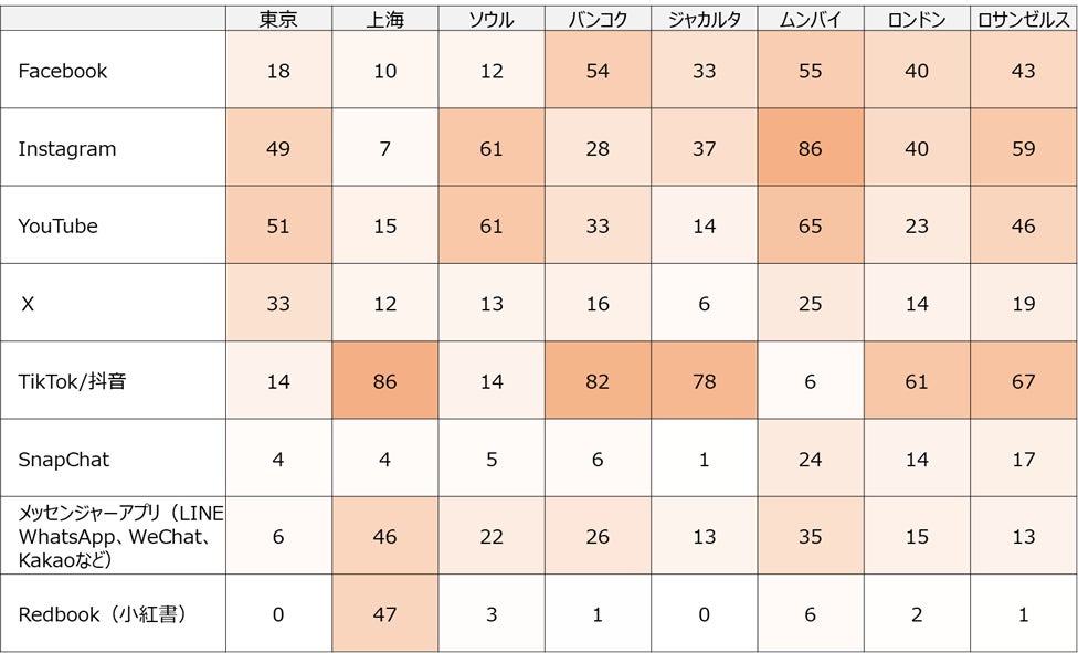 ●利用プラットフォームは「TikTok/抖音」が最も高く、TikTok Shopが展開されている上海、バンコク、ジャカルタ、ロンドン、ロサンゼルスなどの都市ではトップとなった。一方、ムンバイやソウルでは「Instagram」と「YouTube」の利用率が高く、TikTokやTikTok Shopが展開されていない地域でも、ショート動画や画像を起点としたソーシャルコマースが主要な購買チャネルとなっている。