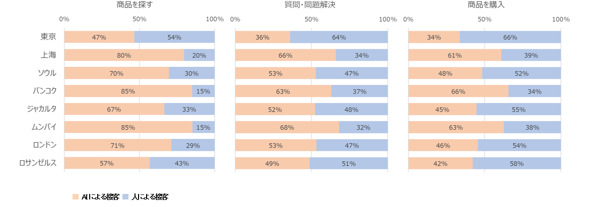 ●都市別にみると、実際の利用率や利用意向を反映して、ムンバイ、バンコク、上海ではいずれの段階でもAIに任せたいという回答が相対的に多い。「商品を探す」段階ではムンバイとバンコクが85%、上海が80%と高く、東京は47%にとどまっている。「商品を購入」でも、上海やバンコク、ムンバイでは「AI接客」への好みが「人による接客」を大きく上回った。