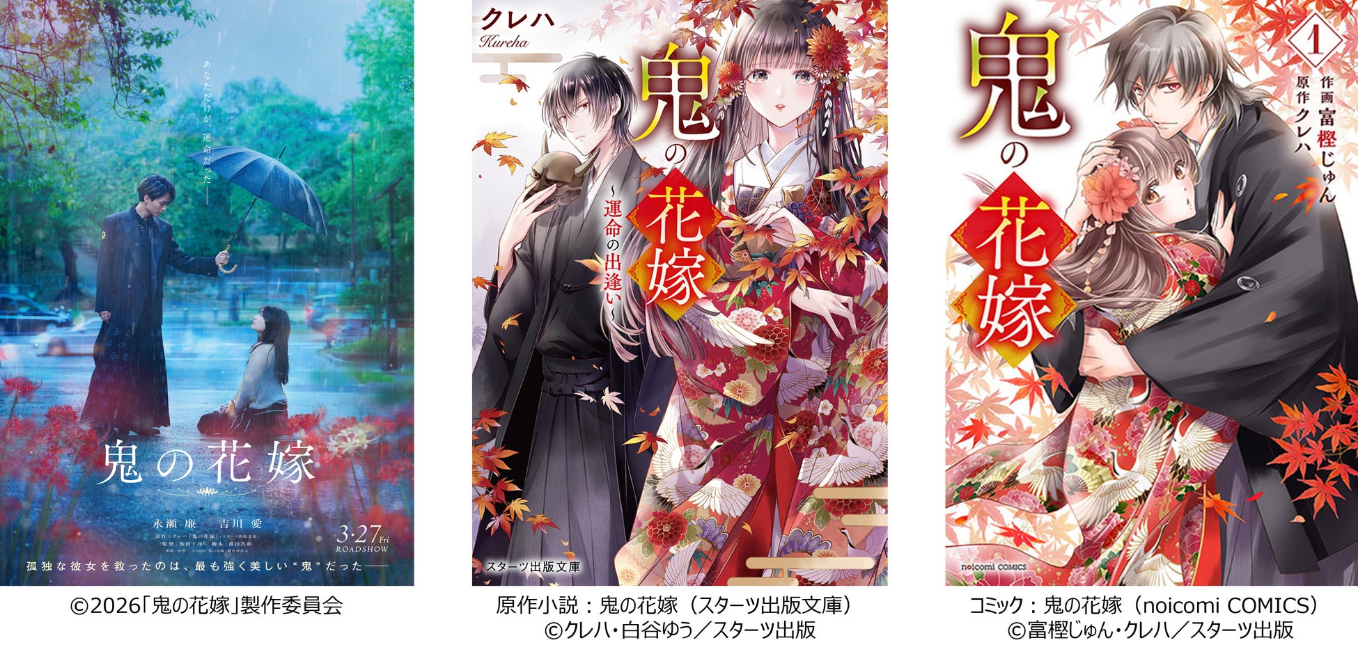 スターツ出版株式会社(本社:東京都中央区、代表取締役社長:菊地修一)発行の『鬼の花嫁』が、永瀬廉 × 吉川愛W主演にて、待望の実写映画化が決定いたしました。原作は、2020 年に刊行され、多くの読者から支持されたクレハ著の小説で、シリーズ累計発行部数580万部(小説・コミックス・電子含む)を突破する大ヒット作品です。 「コミックシーモア年間ランキング 2022・2023」少女コミック編では2年連続 1 位を獲得、「コミックシーモアみんなが選ぶ!!電子コミック大賞 2023」では(男性部門、女性部門を含む)大賞を受賞するなど数々のランキングを席巻。