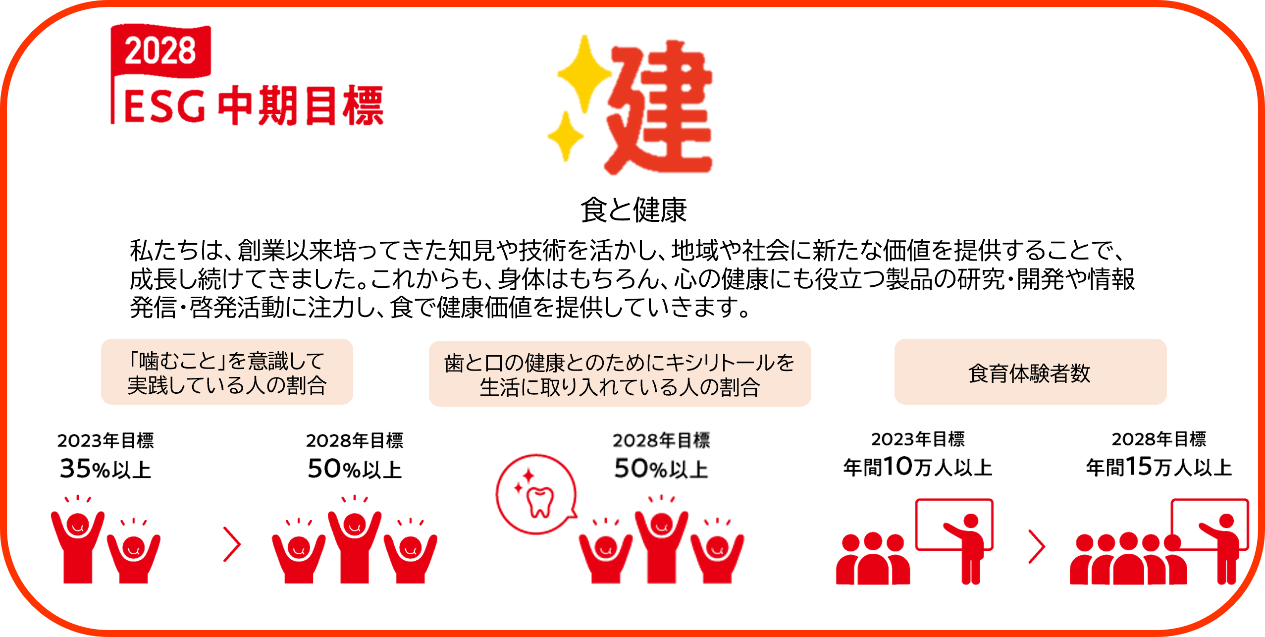 弊社は、「噛むこと」の健康に対する効用を長年研究し、啓発活動にも努めてまいりました。近年では、ESGの中期目標として、「噛むこと」を意識して実践している方の割合、および、歯と口の健康維持、むし歯予防のために、「キシリトール」を生活に取り入れている人の割合を、2028年までに50%にすることを掲げております。