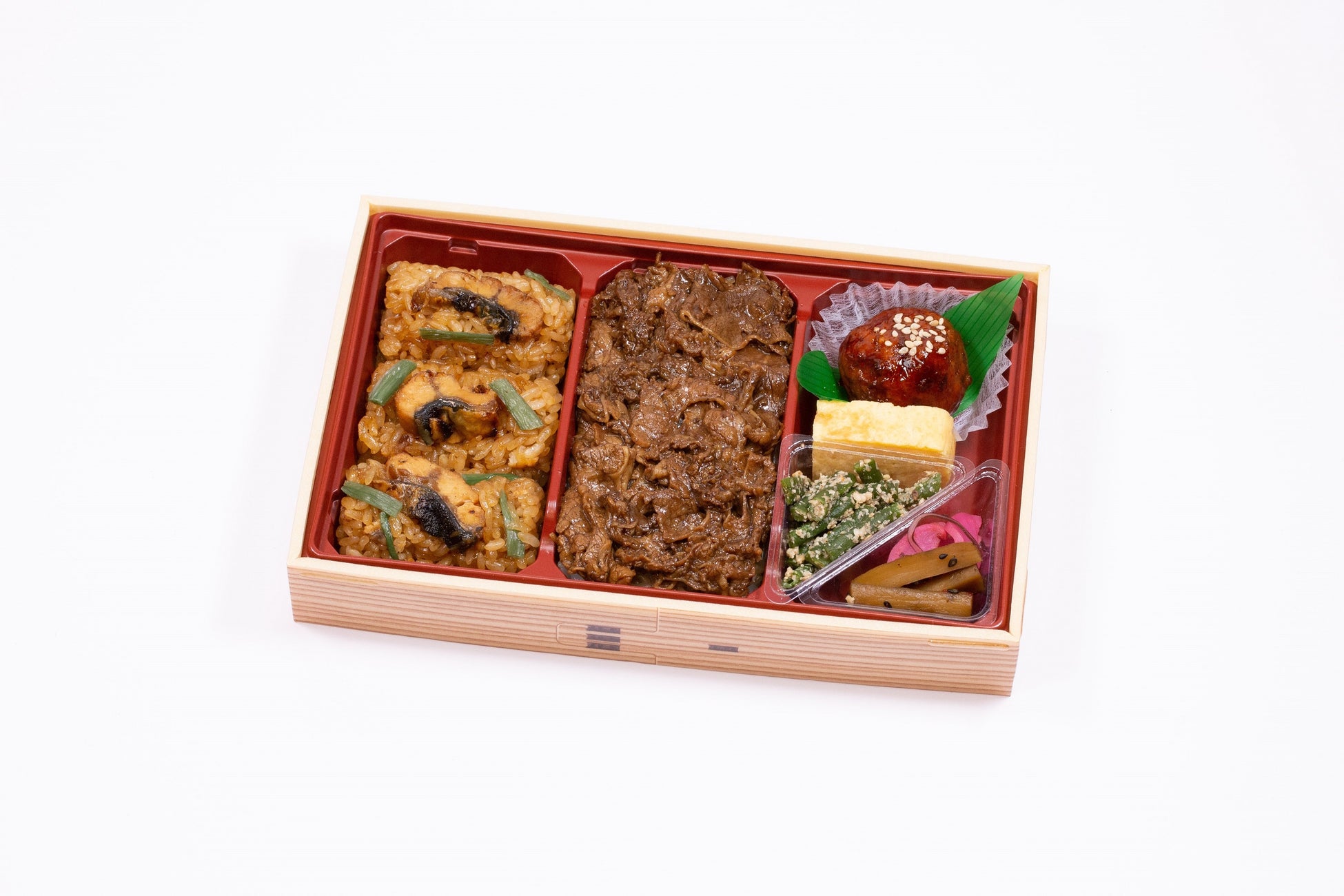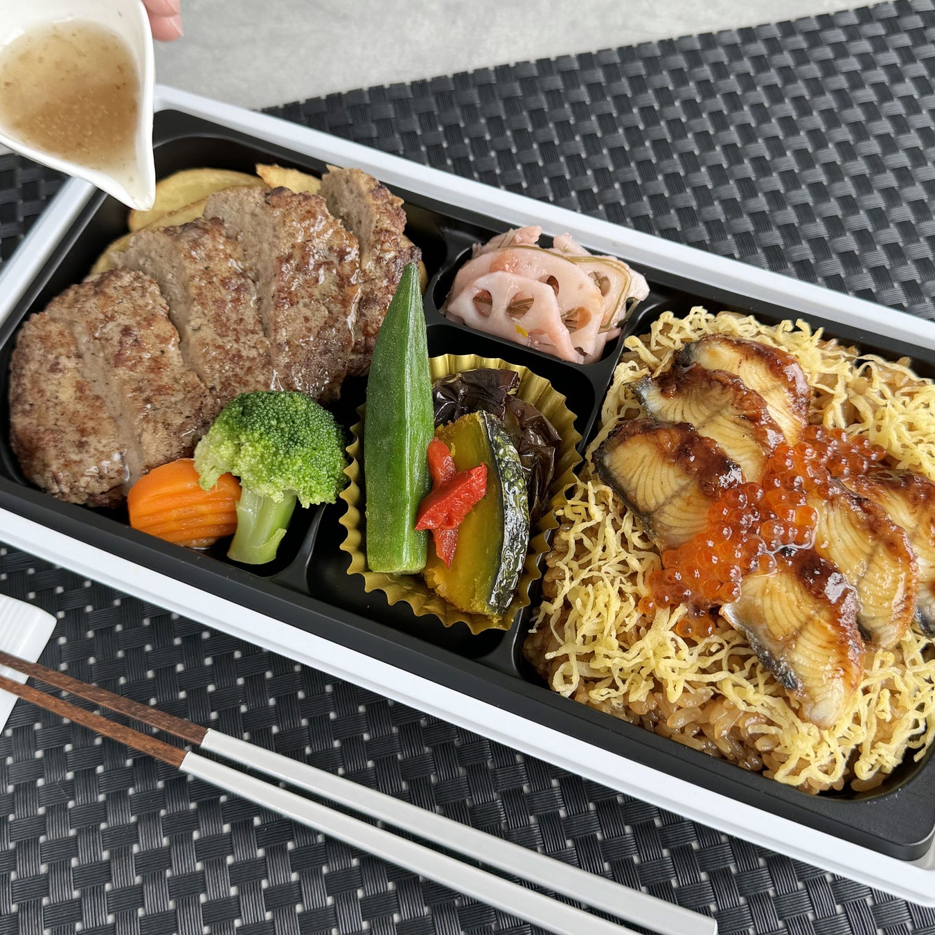 鹿児島産うなぎと米沢牛をふんだんに使った豪華なお弁当。米沢牛はステーキ(ガーリックオニオン味とトリュフ塩味)・焼肉・すき焼が入っています。