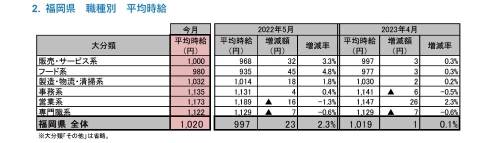[福岡県版]2023年5月度 アルバイト・パート募集時平均時給調査 福岡県の5月度平均時給は前年同月より23円増加の1,020円