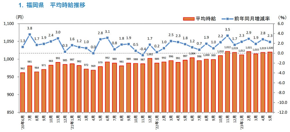 ■福岡県の平均時給は1,020円(前年同月997円、前月1,019円)