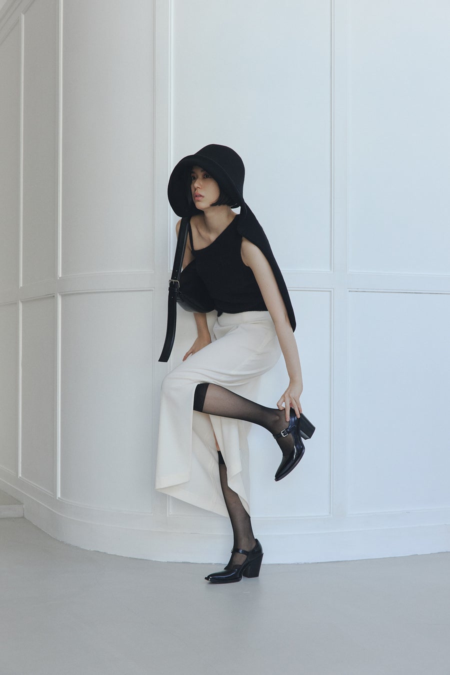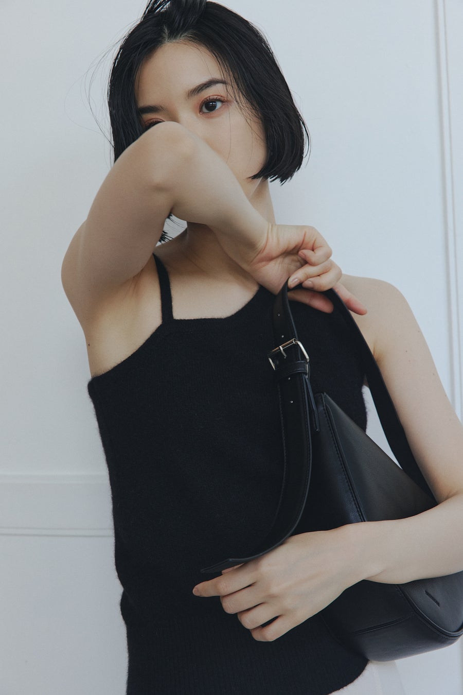 Knit tops ¥12,100 /Skirt ¥17,600 / Bag ¥16,500 / BLK