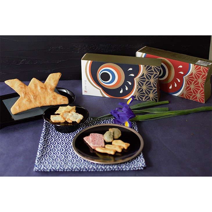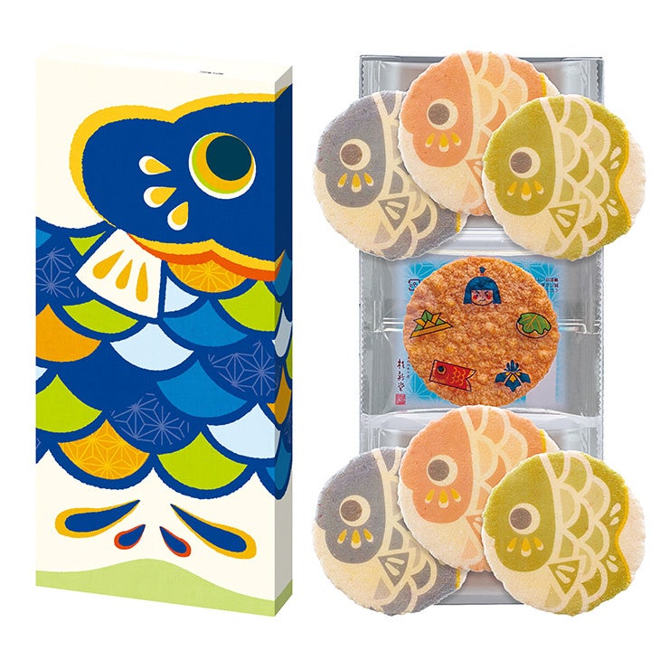 こいのぼりの絵柄のえびせんべいが入った端午の節句限定商品。