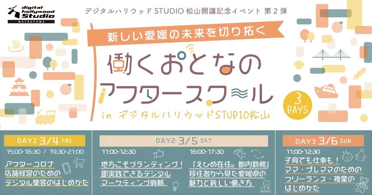 IT関連及びデジタルコンテンツの人材育成スクール、デジタルハリウッド(運営会社:デジタルハリウッド株式会社 本社/本校:東京都千代田区 学長:杉山知之)が運営をする、新しい学びのスタイルを通して多様なライフスタイルを支援し全国へ展開している、Webと動画について学べるラーニングスタジオ『デジタルハリウッドSTUDIO』のSTUDIO松山(運営会社:株式会社さくら印刷 代表:鎌田俊郎)では、5月の開校に先駆け、様々なイベントを開催しています。