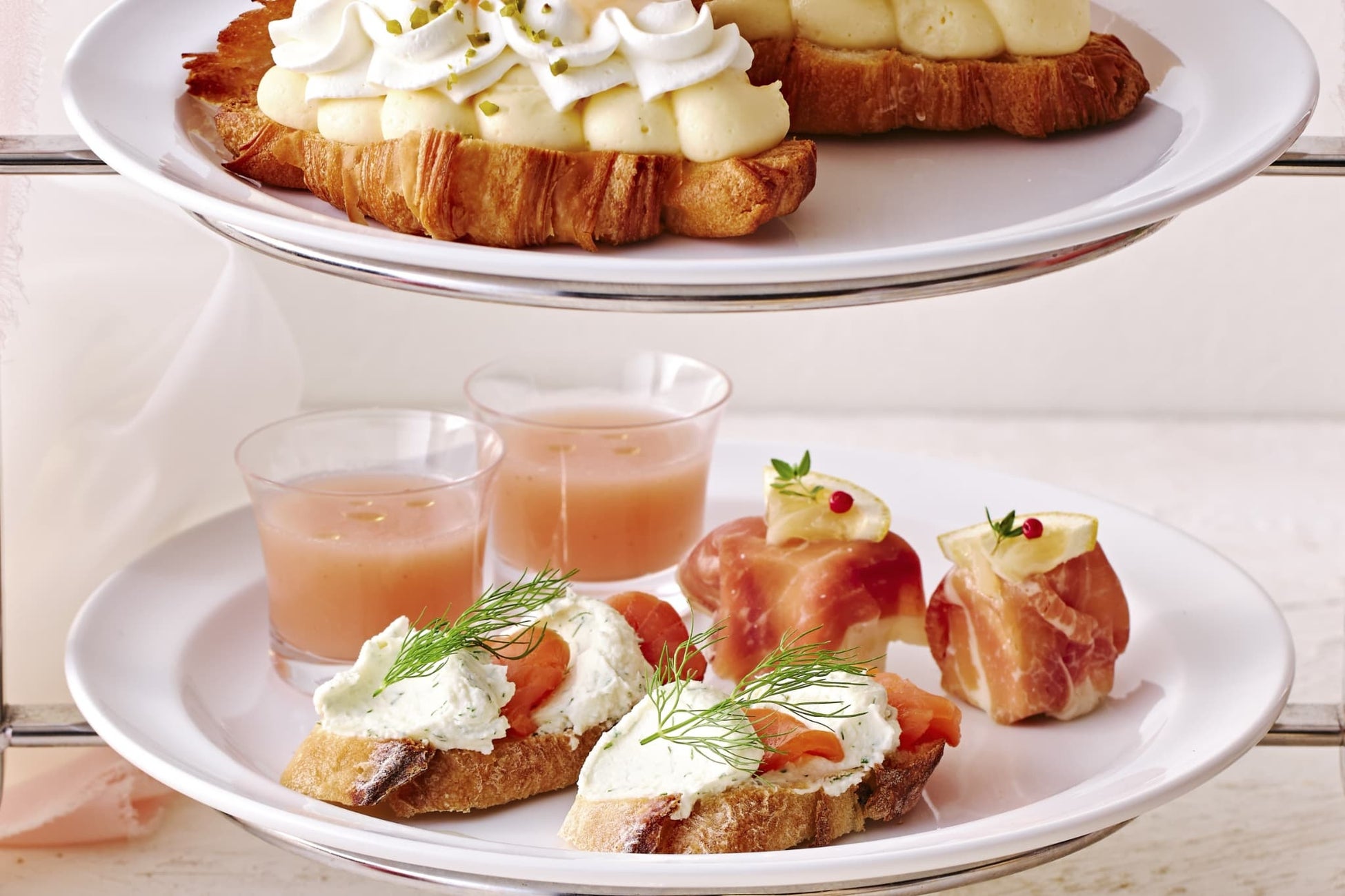 下段は桃と野菜のやさしい甘味の「桃の冷製スープ」、「スペイン産ハモンセラーノ生ハムで包んだ北海道産クリームチーズ」や「ディルが香るサワークリームにスモークサーモンを乗せたブルスケッタ」のセイボリー3種をお楽しみいただけます。