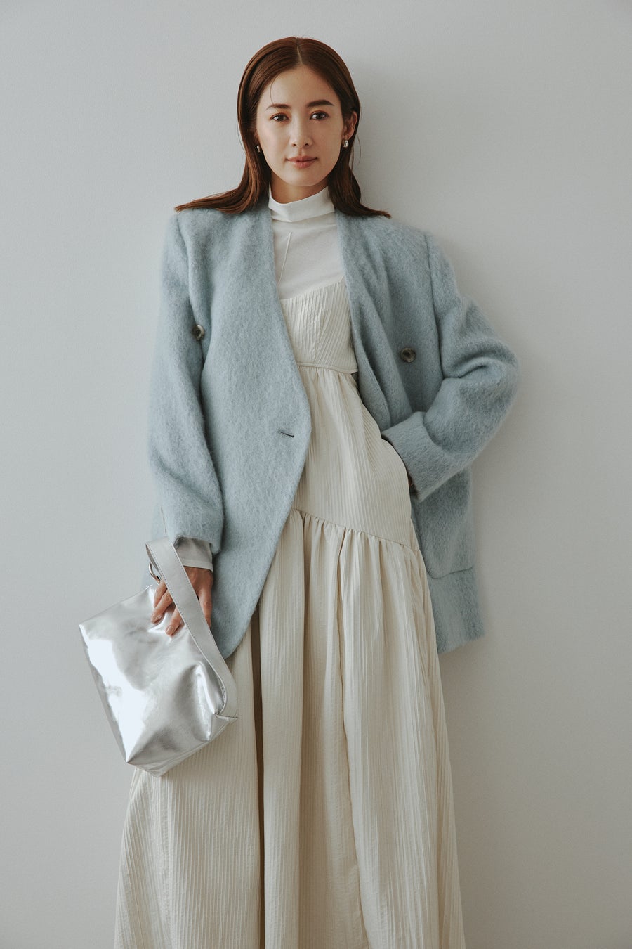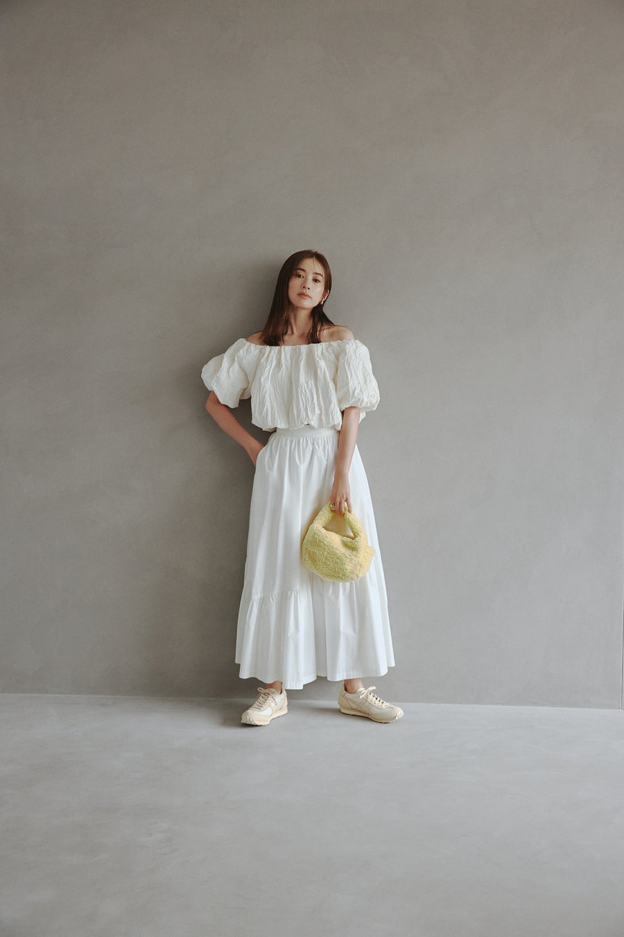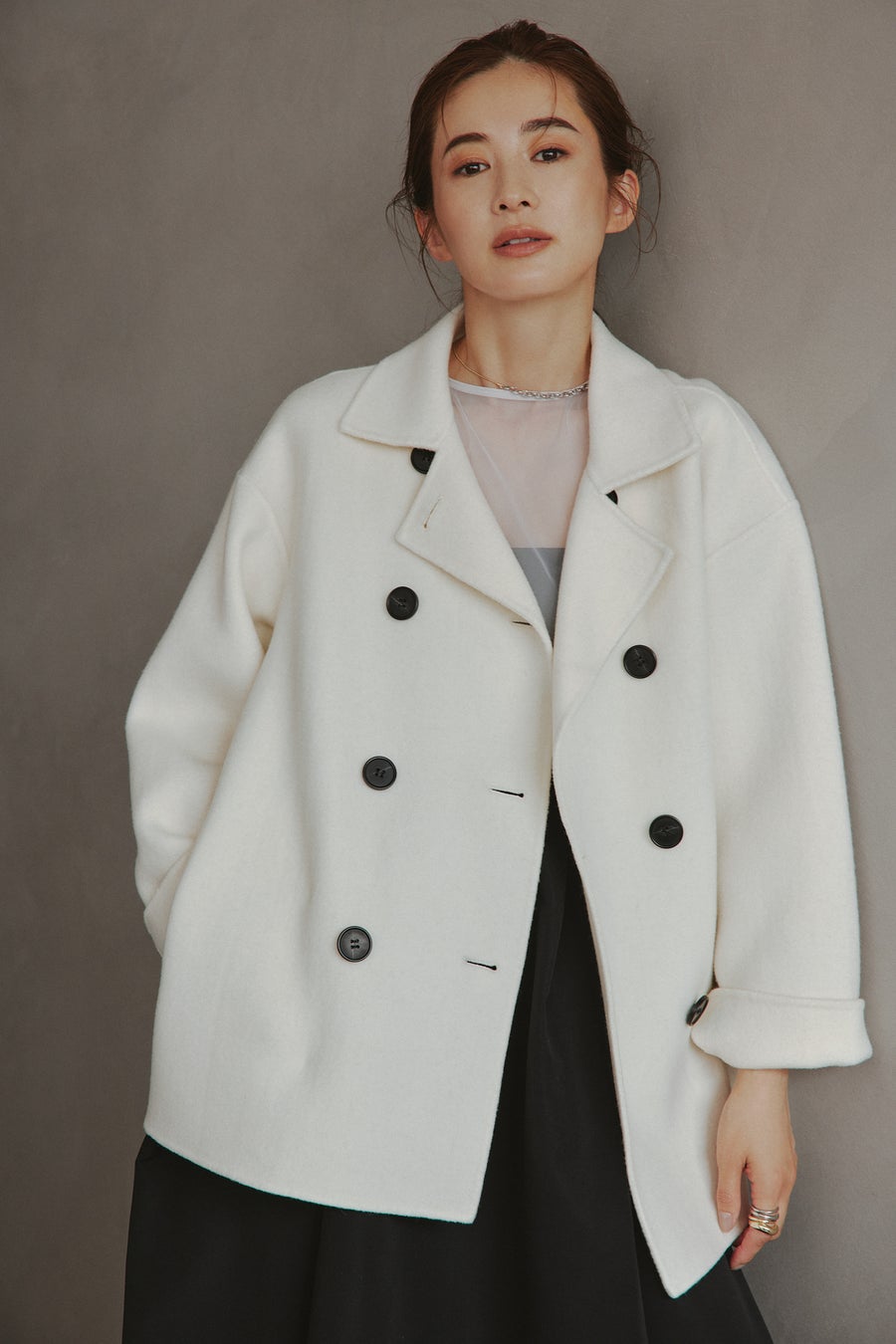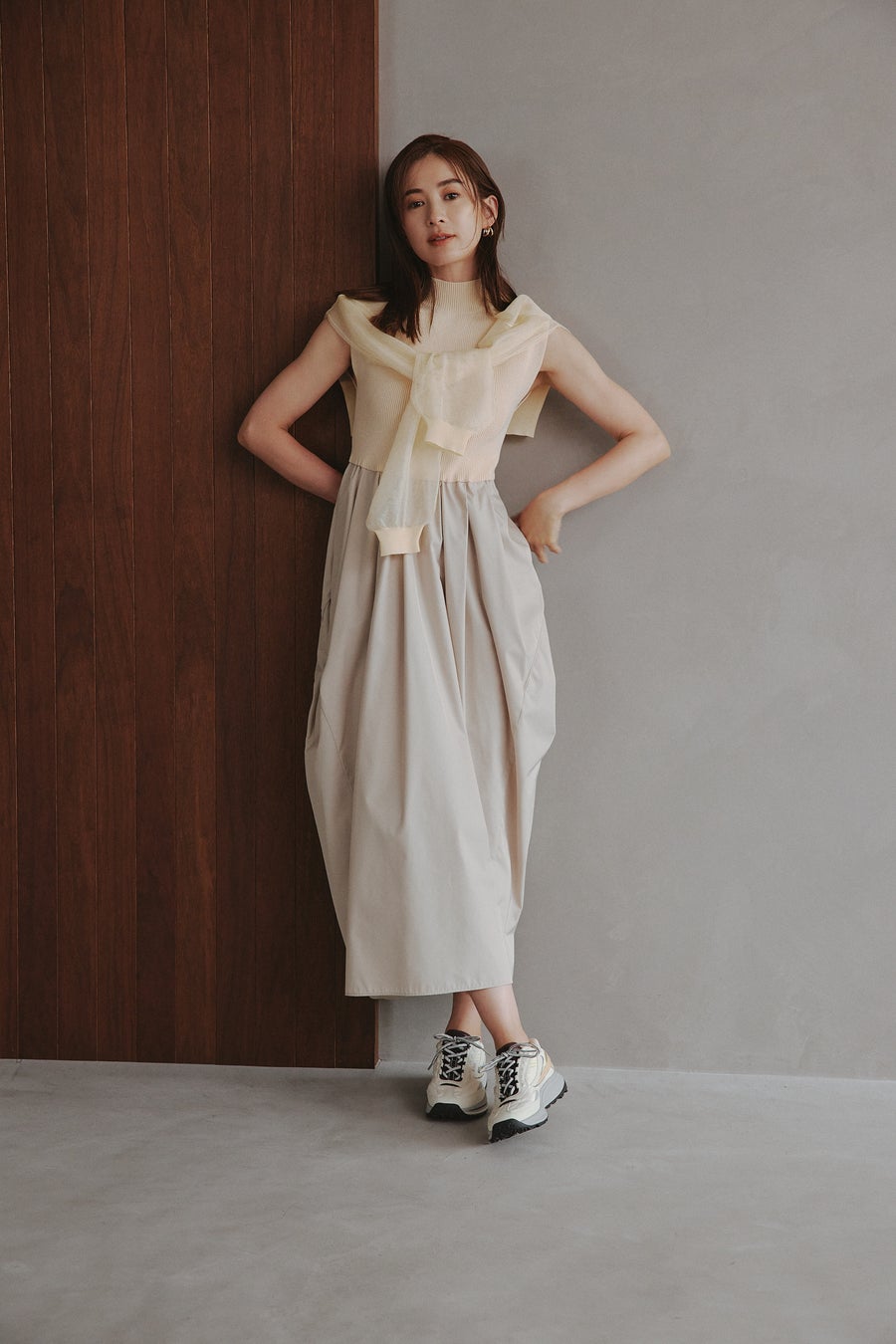 emmiらしいストレスフリーな素材はそのままに、一枚で着映えするアイテムに。