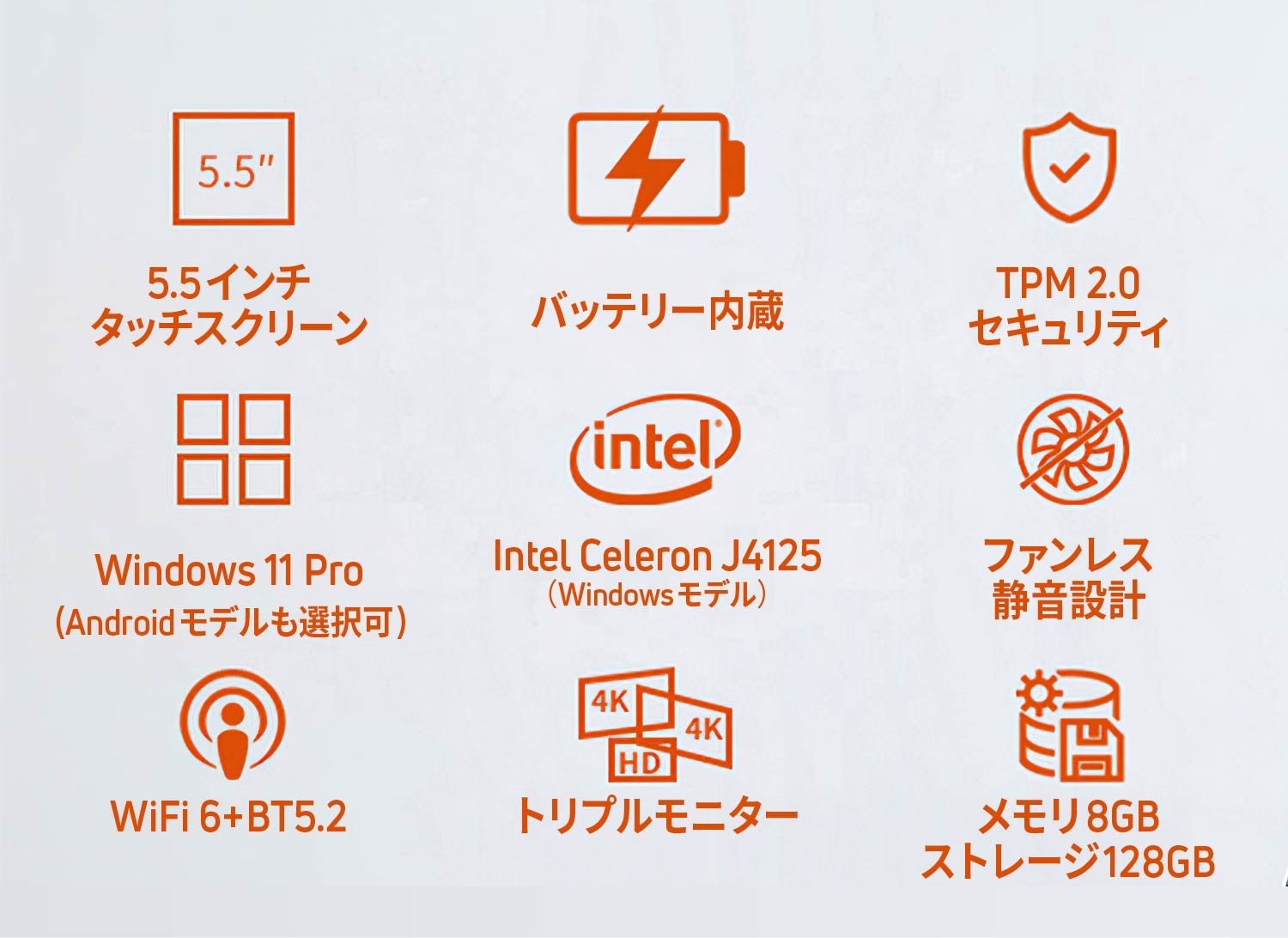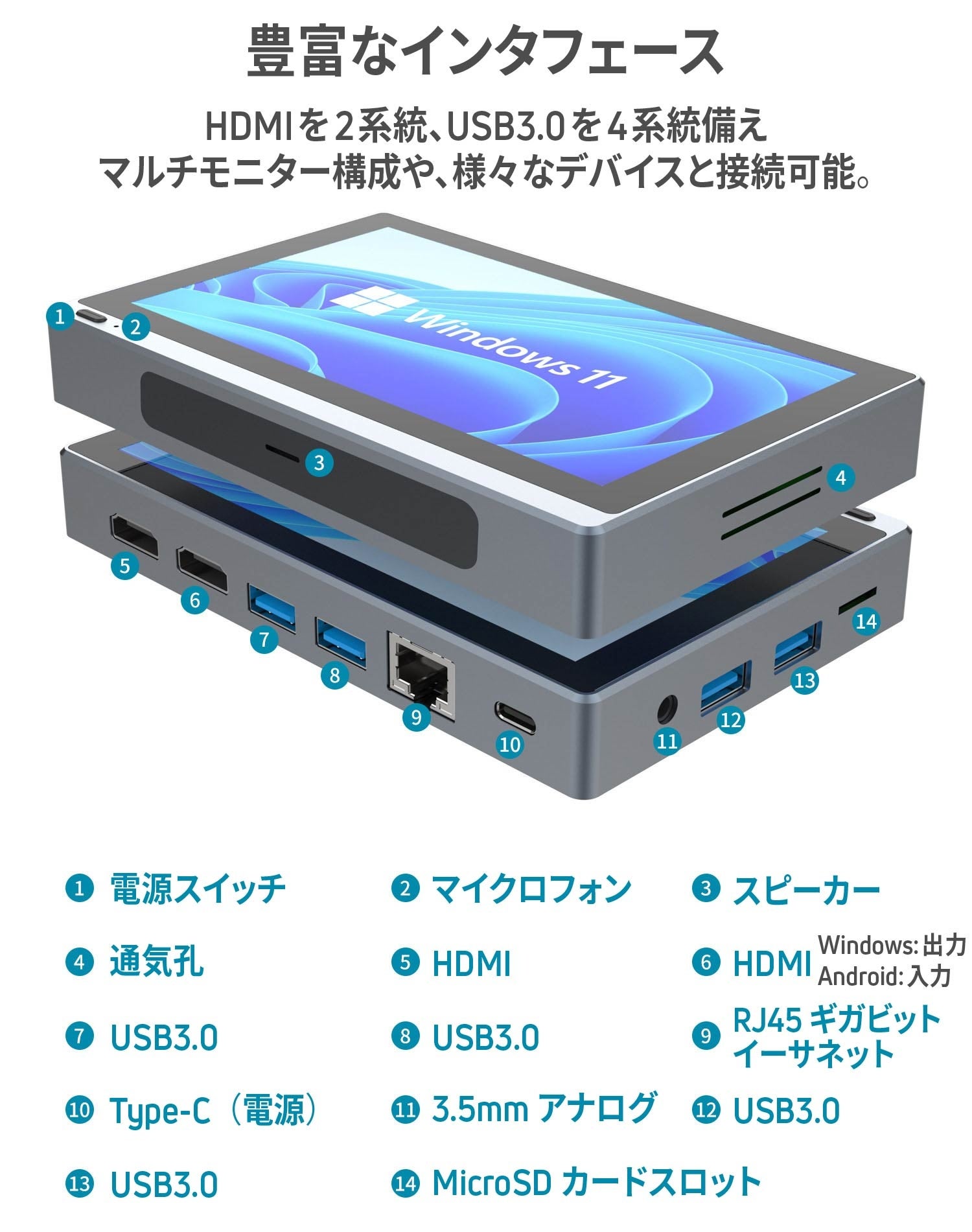 Windows 11 Pro/Android/Intel Celeron 4コア 最大2.70GHz/WiFi 6/Bluetooth 5.2/ギガビット・イーサネット/USB3.0×4、HDMI×2