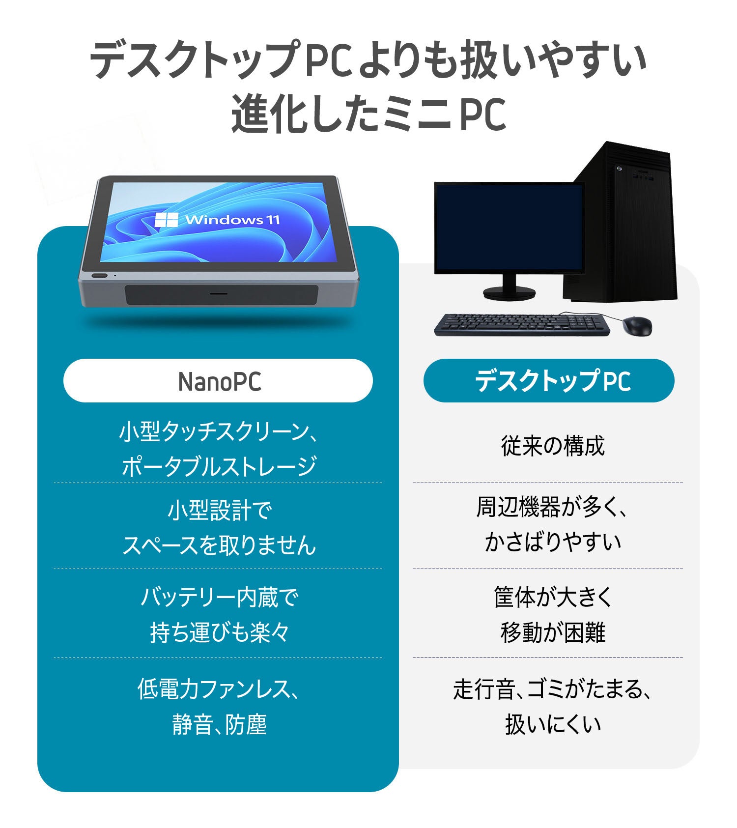 バッテリー内蔵で持ち運びが簡単。どこでも作業が可能なNanoPCは、あなたの生活や仕事をより便利で効率的にします。