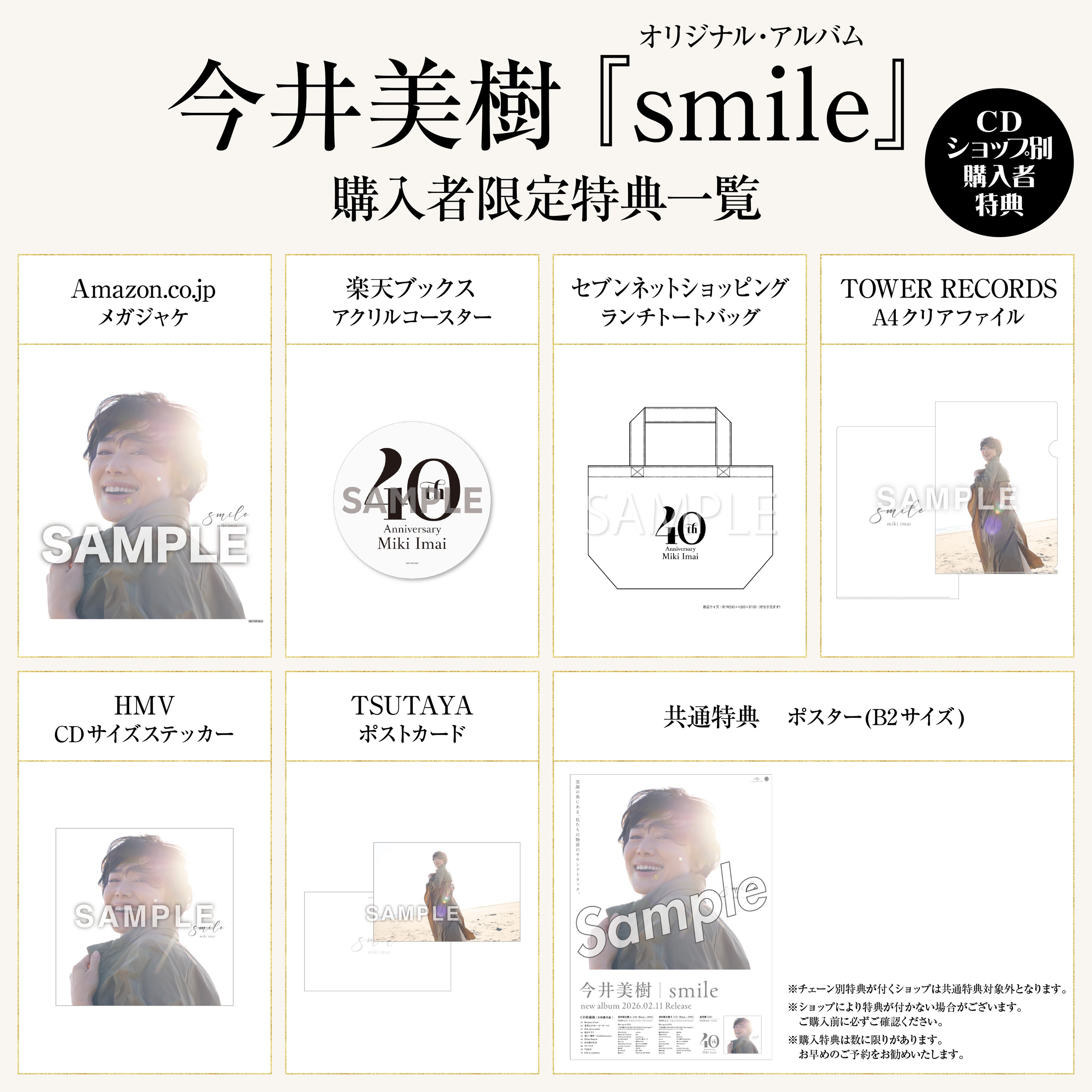全形態の初回生産分限定の封入特典として、5月から始まる全国ホールツアー「今井美樹 40th Anniversary “Our Songs!!” TOUR 2026 〜smile〜」のファンクラブ先行に次ぐプレミアム・リザーブチケット先行抽選受付や、サイン入りポスターが100名様に当たるシリアルナンバーが封入されます。