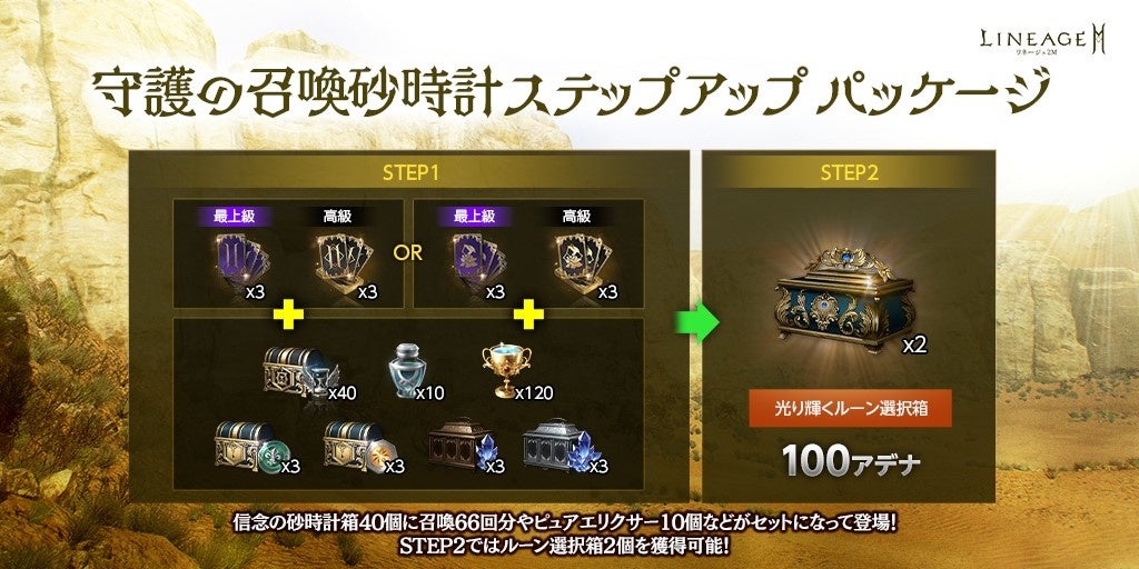 「信念の砂時計箱(刻印)」40個に、クラスまたはアガシオンの召喚66回分、「ピュアエリクサー(刻印)」10個などがセットになった「守護の召喚砂時計ステップアップ パッケージ」が登場しました。