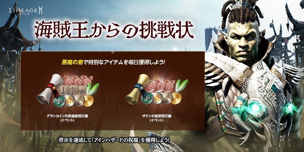 期間中、アリーナ ダンジョン「悪魔の島」のロビーに出現するイベントNPC「アデン騎士団長(イベント)」からは「ザケンの秘密啓示書(イベント)」「ザケンの秘密の箱(イベント)」をアデナで獲得することができます。さらにレベル75以上のキャラクターの場合は「グランカインの英雄級啓示書(イベント)」をアデナで獲得することが可能です。