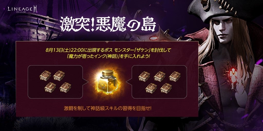 また、8月13日(土)22時から、「悪魔の島」に出現するボス モンスター「ザケン」を討伐時、「魔力が宿ったインク(神話)」が必ずドロップします。