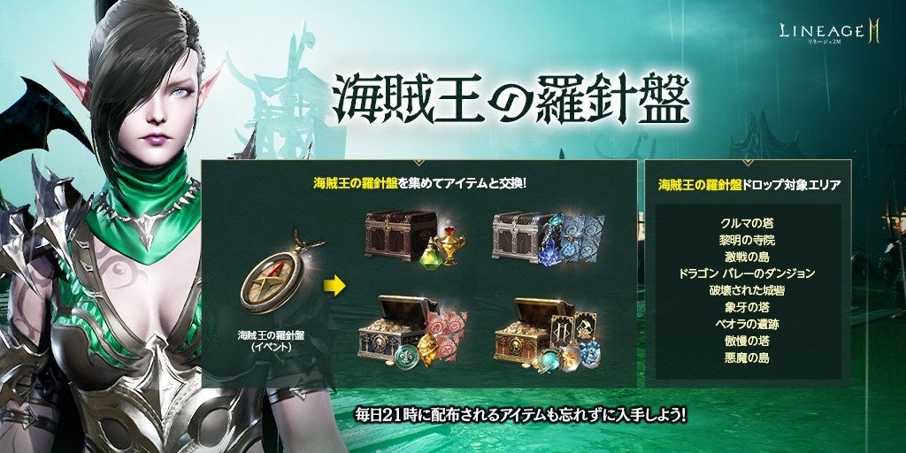 期間中、特定のダンジョンのモンスターを討伐時、「海賊王の羅針盤(イベント)」が一定確率でドロップします。集めた「海賊王の羅針盤(イベント)」はアデン大陸の各村に出現するイベントNPC「ヘルフリン」から「海賊王の宝の地図(イベント)」や「海賊王が略奪した箱(イベント)」など様々なイベントアイテムのほか「ピュアエリクサー(刻印)」などのアイテムと交換することができます。