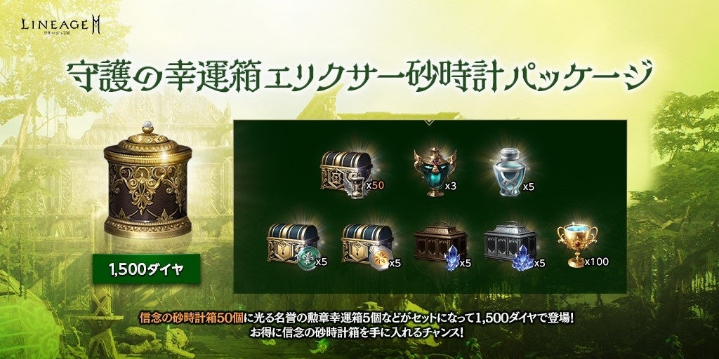 「信念の砂時計箱(刻印)」50個や、「ピュアエリクサー(刻印)」5個、「祝福されたアインハザードの聖水(刻印)」3個などがセットになった「守護の幸運箱エリクサー砂時計パッケージ」が登場しました。
