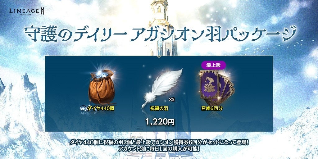 ダイヤ440個と、「信念の最上級アガシオン獲得券(6回)(刻印)」1個、「祝福の羽」2個がセットになった「守護のデイリー アガシオン羽パッケージ」が登場しました。