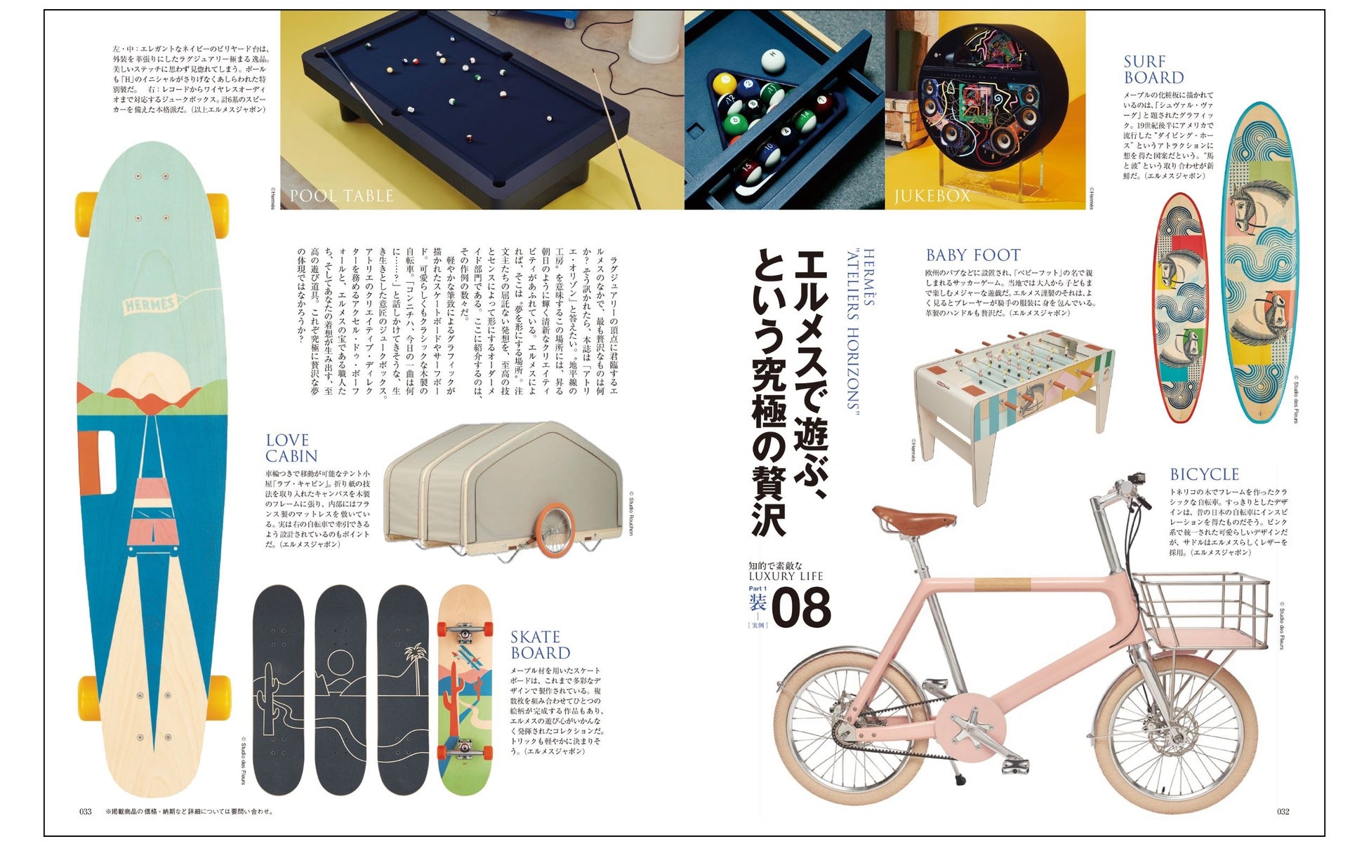 また、普段はなかなか目にすることがない最高峰ラグジュアリーブランドの特別なオーダーを紹介。エルメスには”アトリエ・オリゾン”という夢を形にするオーダーの部門が存在する。ビリヤード台、スケートボード、ジュークボックスなど、至高の遊び道具。これぞ究極のラグジュアリーである。