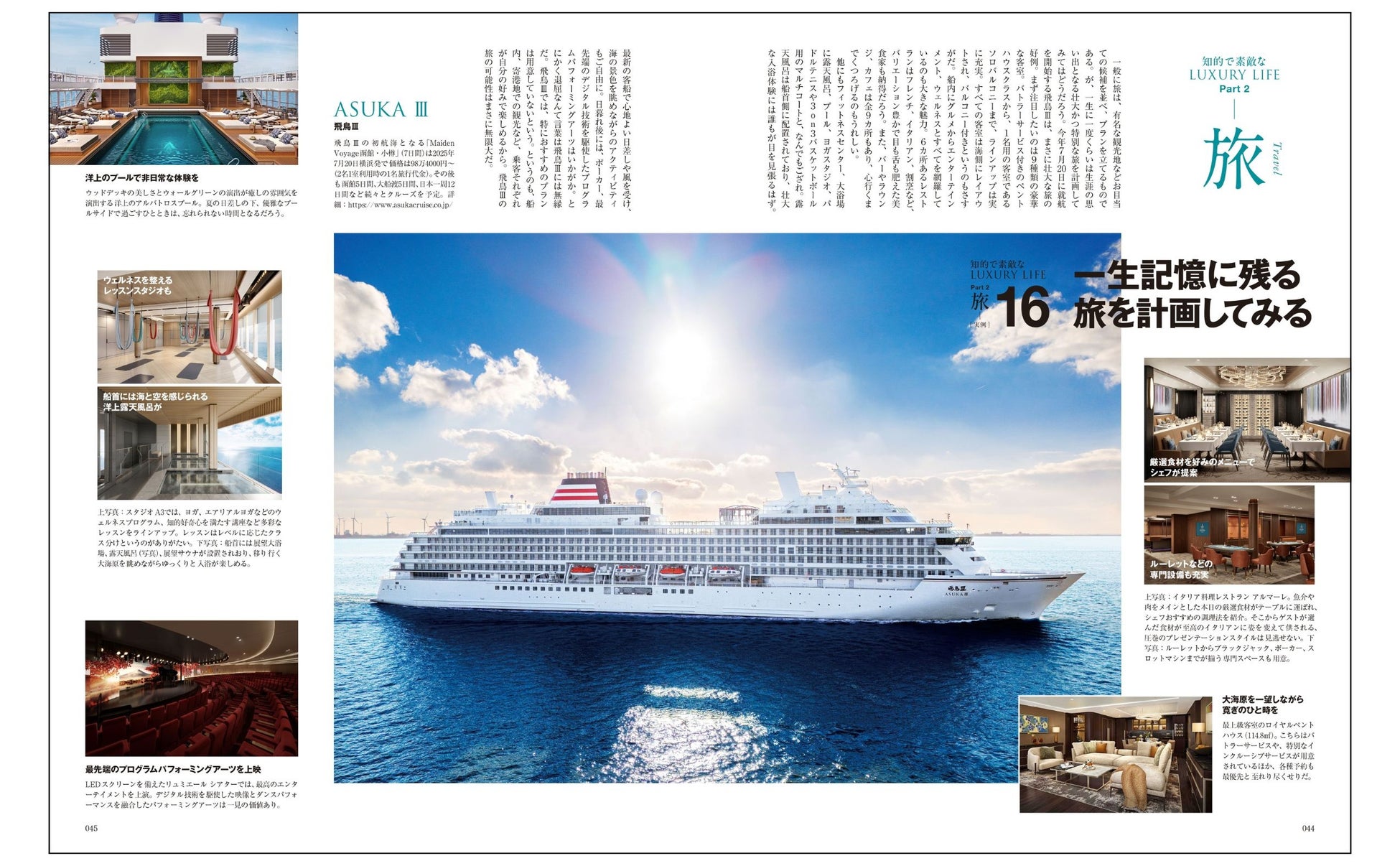 同特集内では、これから旅の計画を立てたい方にお薦めのラグジュアリー旅の提案も。例えば、7月20日に就航を開始する”飛鳥Ⅲ”は日本の豪華客船の最高峰。船内でのラグジュアリーな愉しみが充実しているのはもちろん、寄港地での観光プランも多彩な新しい旅のカタチだ。