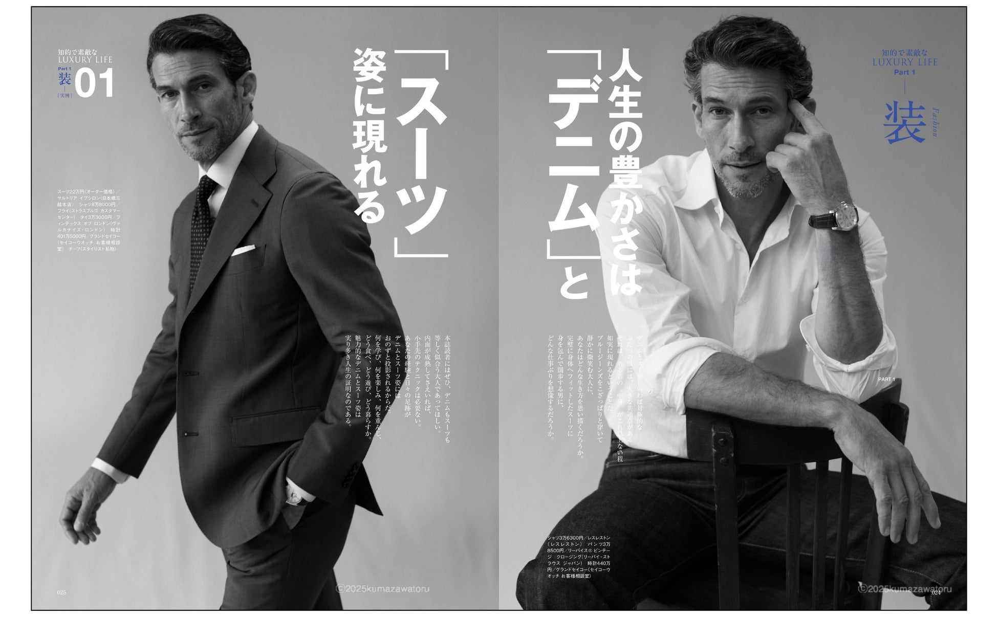 今号の大特集では、いま、大人の装いに於いて大切なことをストイックに提案。例えば、人生の豊かさは「デニム」と「スーツ」姿に現れる。この2つほど、着る人の”中身”が現れる装いはない。デニムとスーツが等しく似合う大人こそラグジュアリーな生きざまであると紹介。
