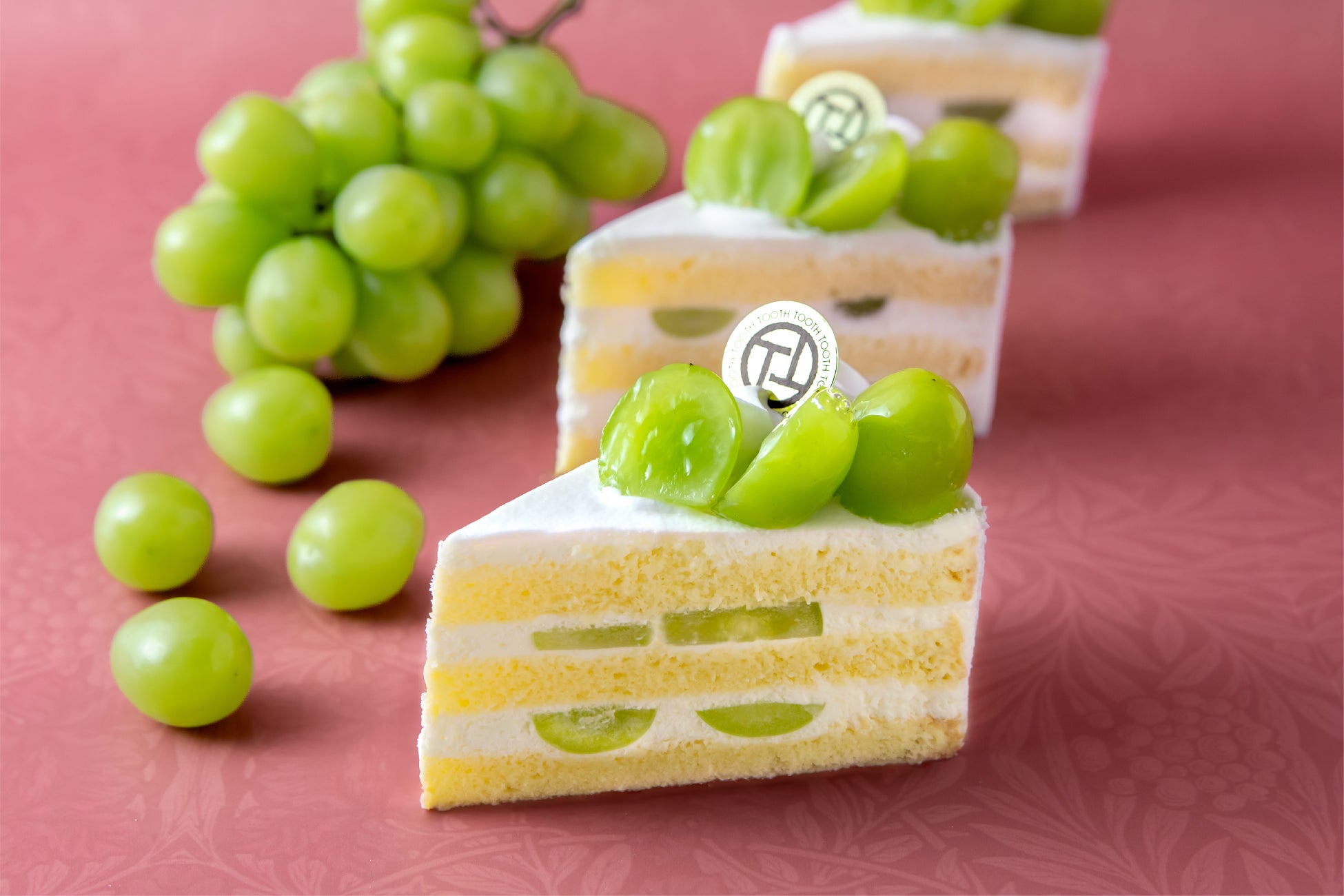 しっとりとしたくちどけのジェノワーズに、みずみずしいシャインマスカットとミルキーなシャンティクリームをサンド。三層に重ねたふわふわの生地から、果汁あふれるシャインマスカットの甘さが広がる季節のショートケーキ。