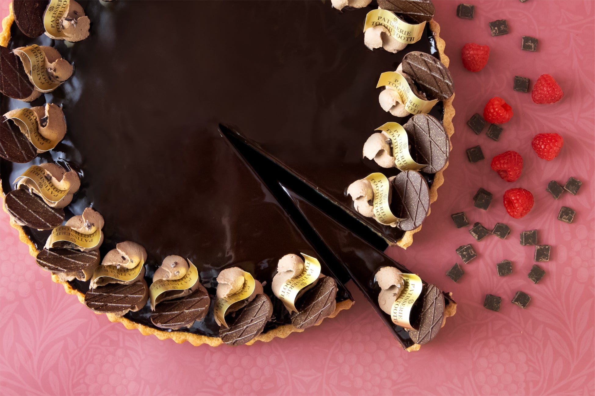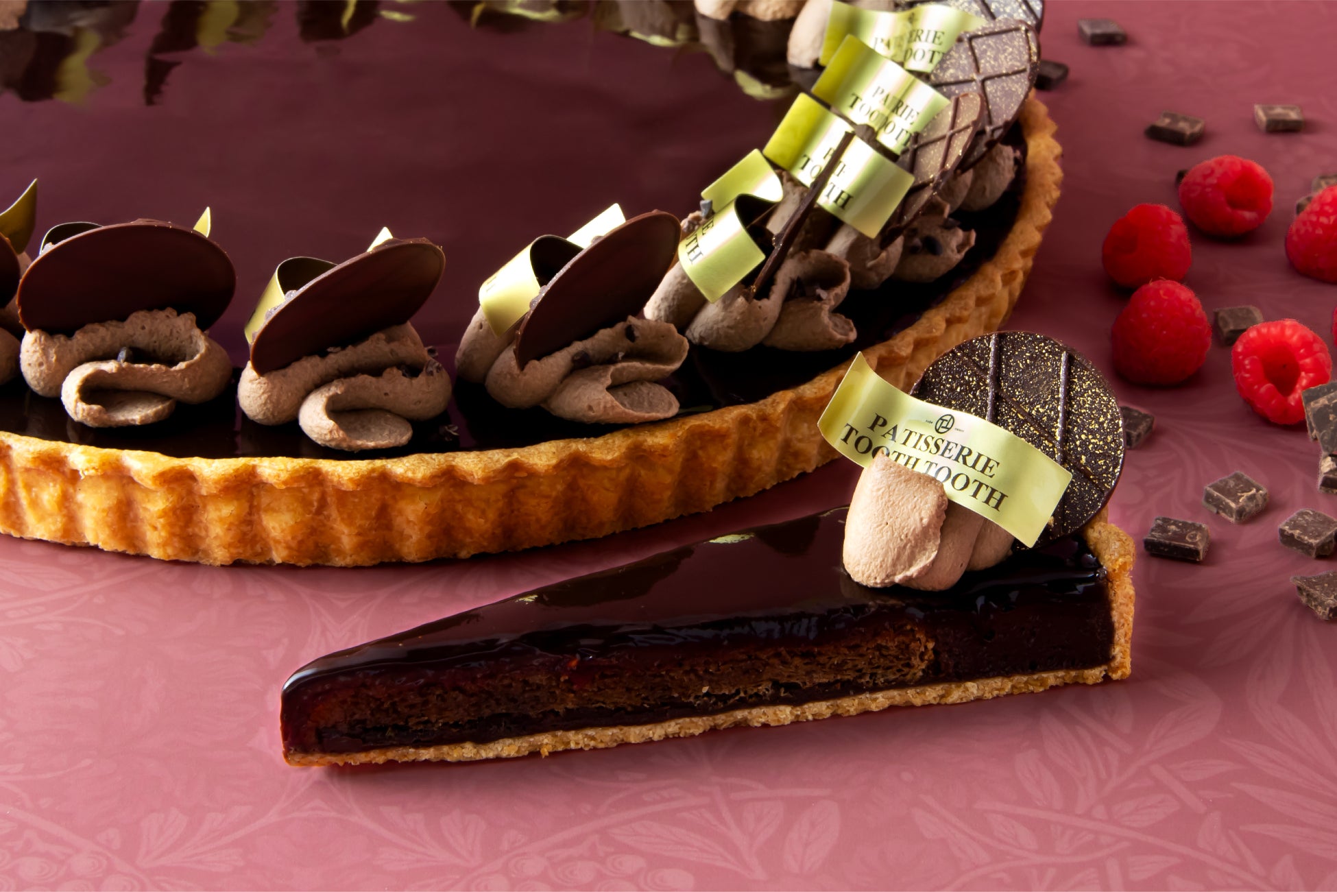 芳醇なショコラと、フランボワーズのガナッシュとコンフィチュールが織りなすタルト。なめらかなスイートチョコレートにショコラシャンティやカカオニブ、ココアが重なり、豊かなショコラの風味が広がります。フランボワーズの果実感が、華やかで甘酸っぱいアクセントに。