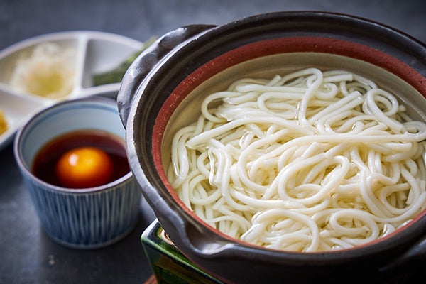卵黄を入れたあご出汁のつゆで食べる寒くなる時期にぴったりな体が温まる