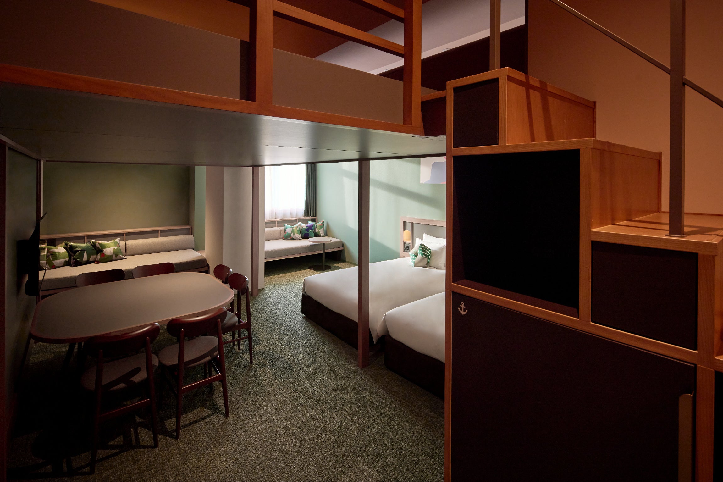 全276室、広さ20㎡から73㎡の全9タイプを用意。客室のテーマカラーである赤・青・緑は、それぞれ旧横浜市庁舎内で使用されていた色を落とし込んでいます。赤は旧議長室の絨毯の色、青は旧市庁舎内の艶のある磁器質タイルの色、緑は旧市会棟本会議場の絨毯や議員席の色をイメージしています。また、最大6名まで宿泊できる「やぐらスイート」は、広さと高さを兼ね備え、友人グループや家族で利用する際も同じ空間でゆったりと過ごせます。最大4名定員の「かたりばルーム」は、2名で広々と贅沢に過ごすことはもちろん、4名でソファを囲み、語らいながら楽しむのもおすすめです。その他、部屋タイプの異なる個性豊かな客室を用意し、旅のシチュエーションごとに選ぶことができます。