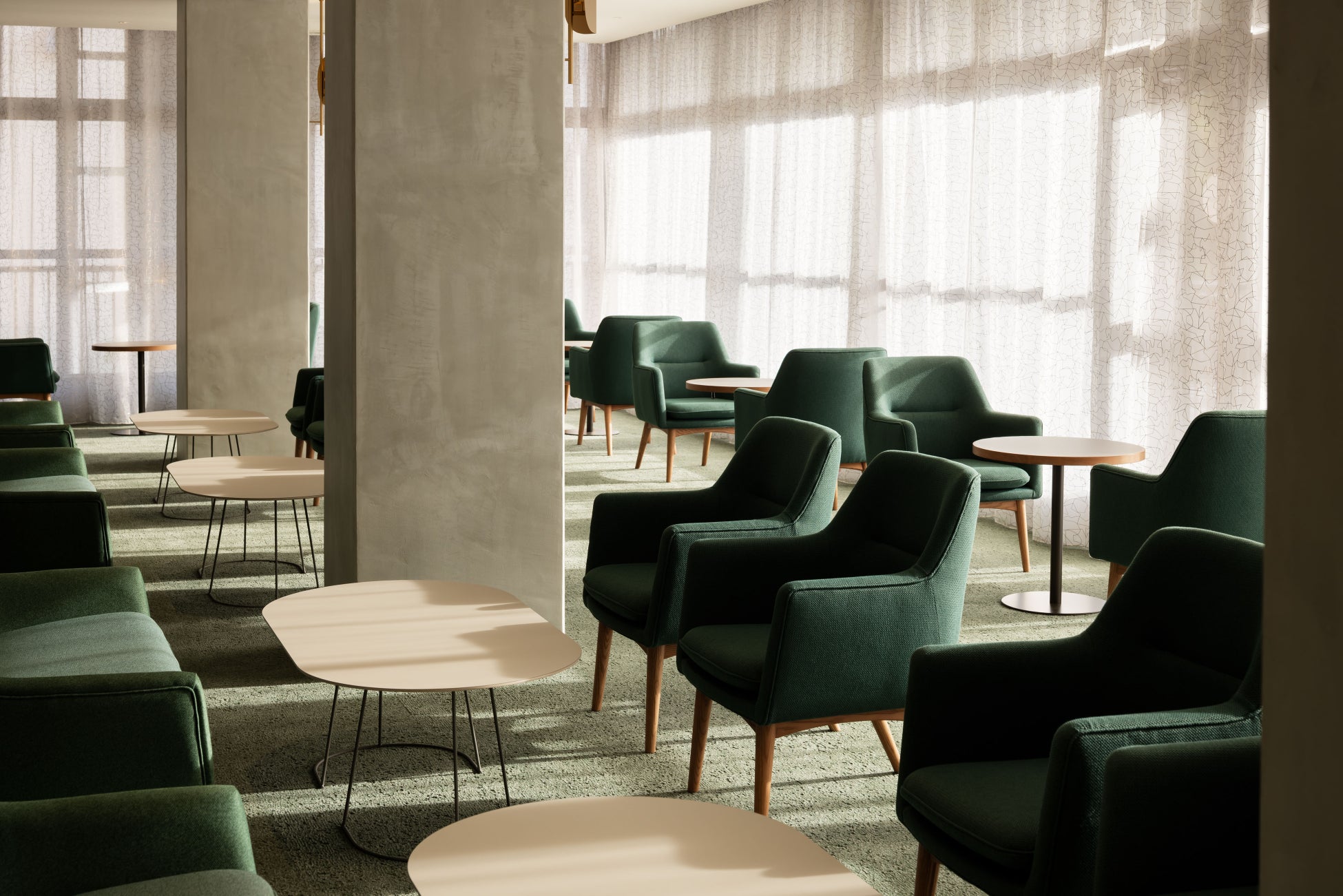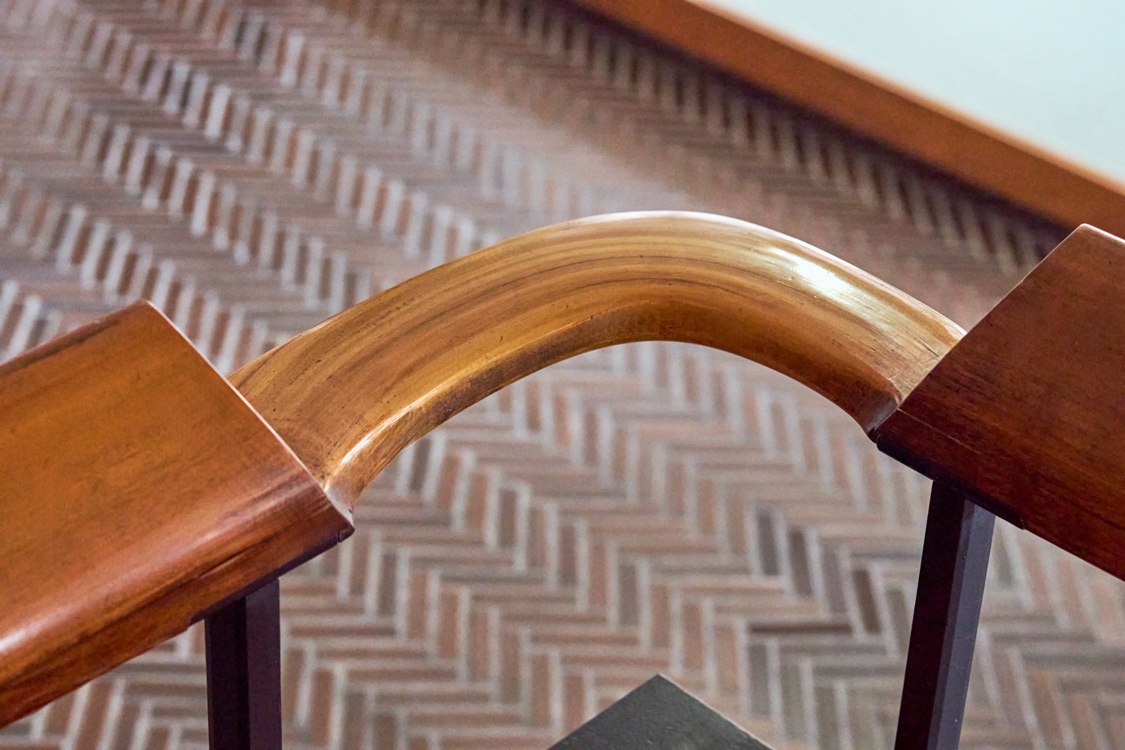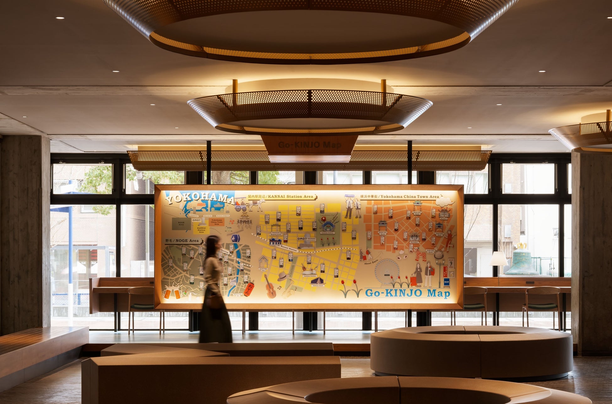 多くの人々が行き交う「OMOベース」には、1階と2階を繋ぐシンボリックな大階段を設置しました。これは旧横浜市庁舎の象徴であった旧市民広間 大階段のデザインを継承し、再構築したものです。村野氏のデザインを象徴する、滑らかな曲線を描く手すりの一部も再活用。賑わいの中心にふさわしい存在感を放ちます。2階の窓際の椅子には、旧市会棟本会議場の議員席を再利用。かつての威厳ある椅子が、ゲストがゆったりと寛げる場所へと生まれ変わりました。