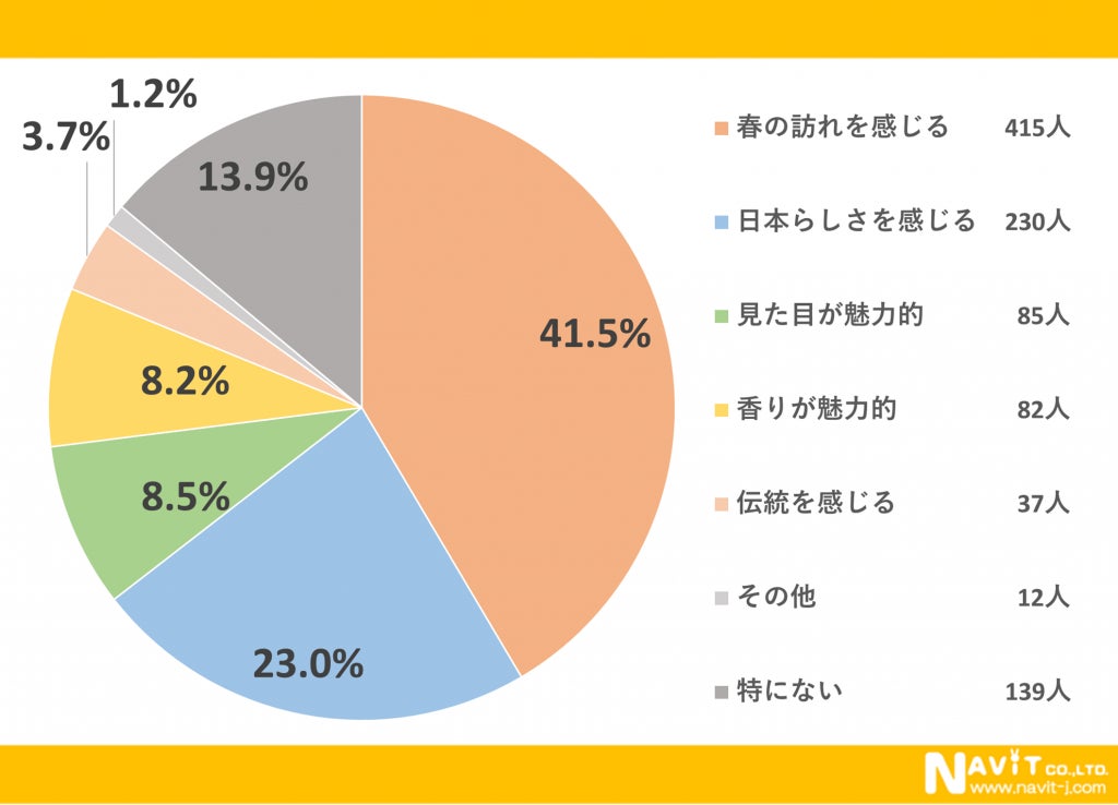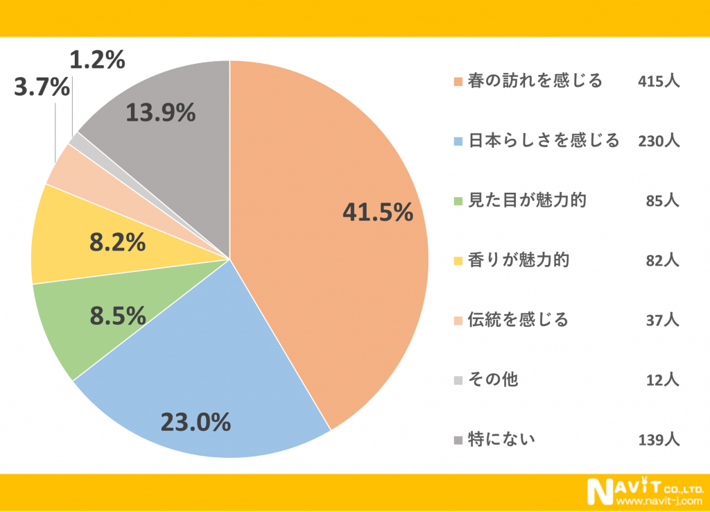 梅の花の印象についてのアンケートです。一番多かったのは「春の訪れを感じられる」で41.5%と4割以上でした。次に「日本らしさを感じる」が23.0%、「見た目が魅力的」が8.5%という結果になりました。