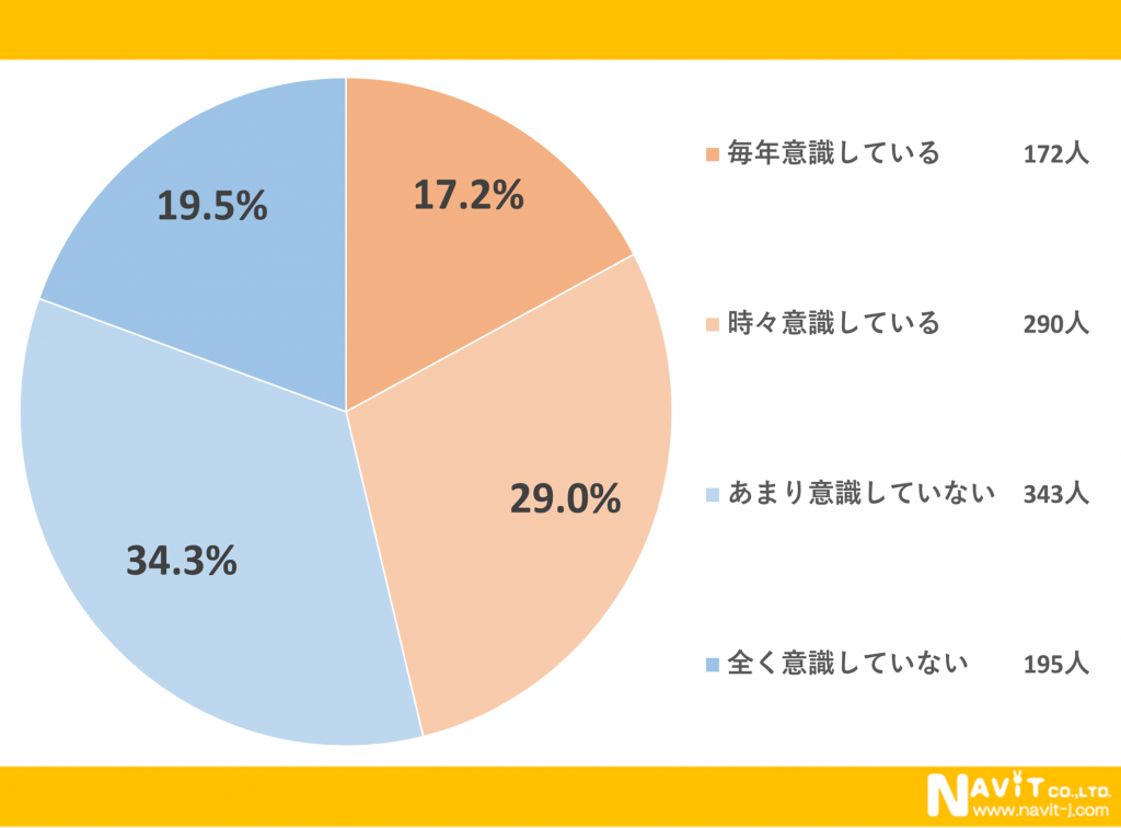 梅の花の時期を意識しているかというアンケートです。「毎年意識している」と回答された人は17.2%で「時々意識している」と回答された人は29.0%と、意識している人は少なめという結果になりました。都市部では梅の木を見る機会が少ないのが原因の一つでしょうか。