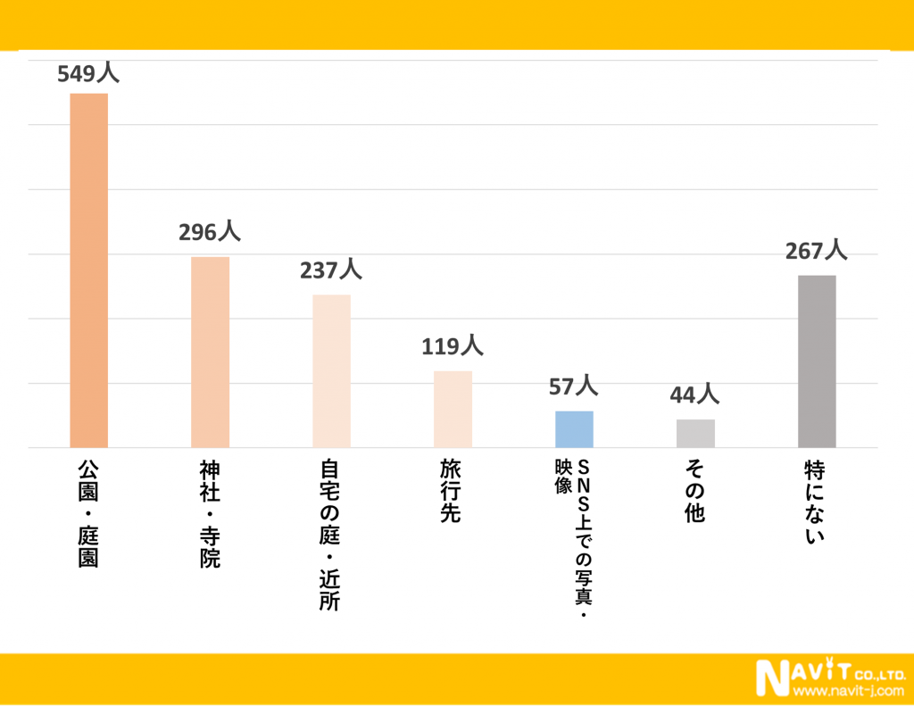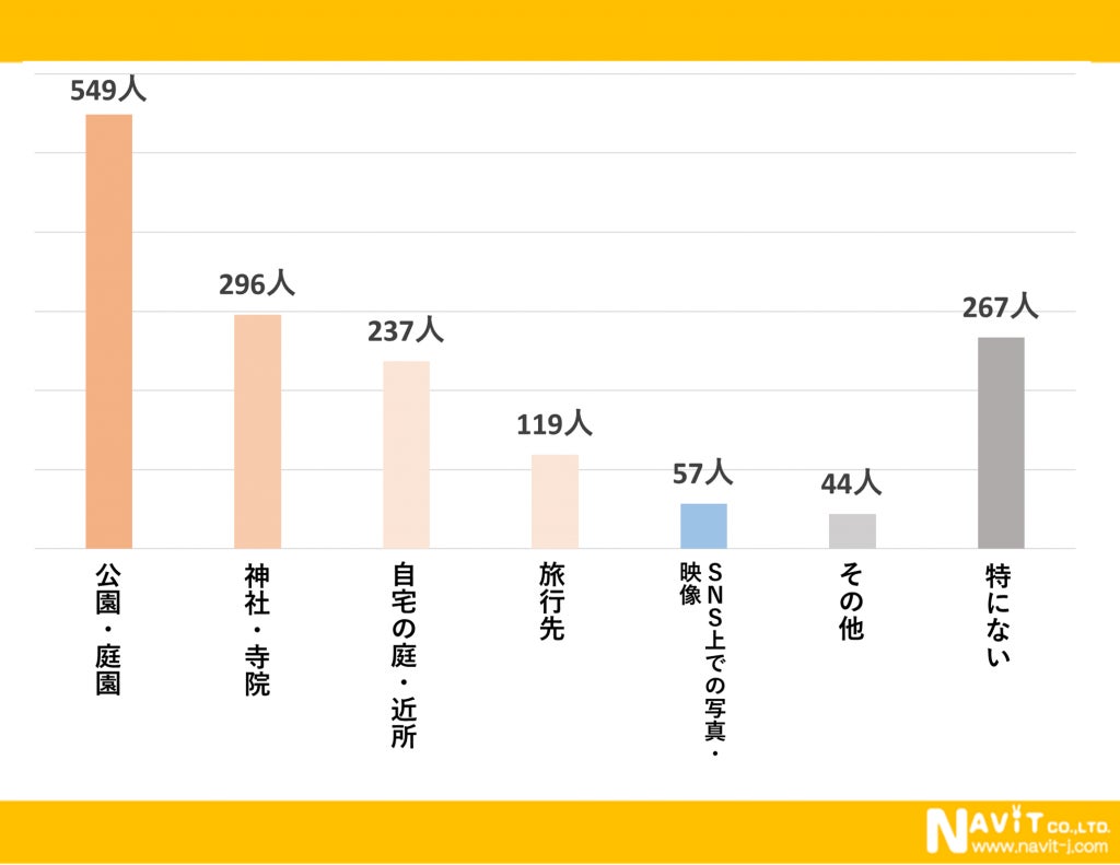梅の花を楽しむ場面についてのアンケートを複数回答にていただきました。一番多かったのは「公園・庭園」で549人、次に多かったのが「神社・寺院」で296人、「自宅の庭・近所」が237人と続きました。