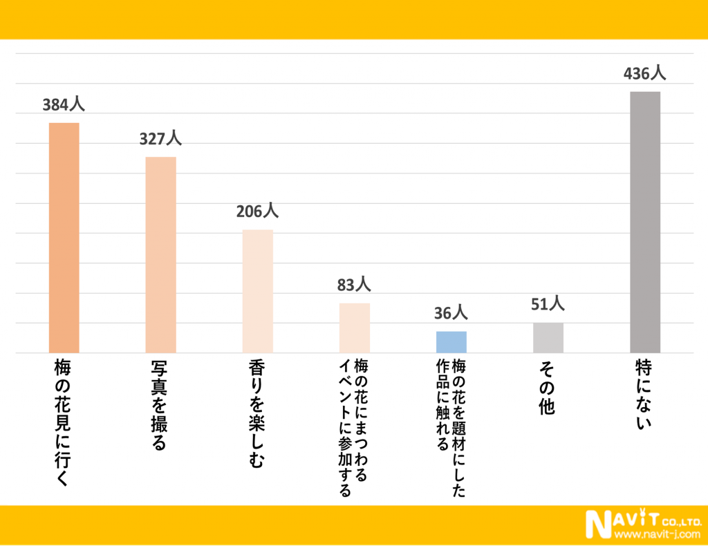 梅の花に関して、これまでに経験したことについてのアンケートを複数回答にていただきました。一番多かったのは「梅の花を見に行く」で384人でした。次に多かったのは「写真を撮る」が327人、「香りを楽しむ」が206人という結果になりました。